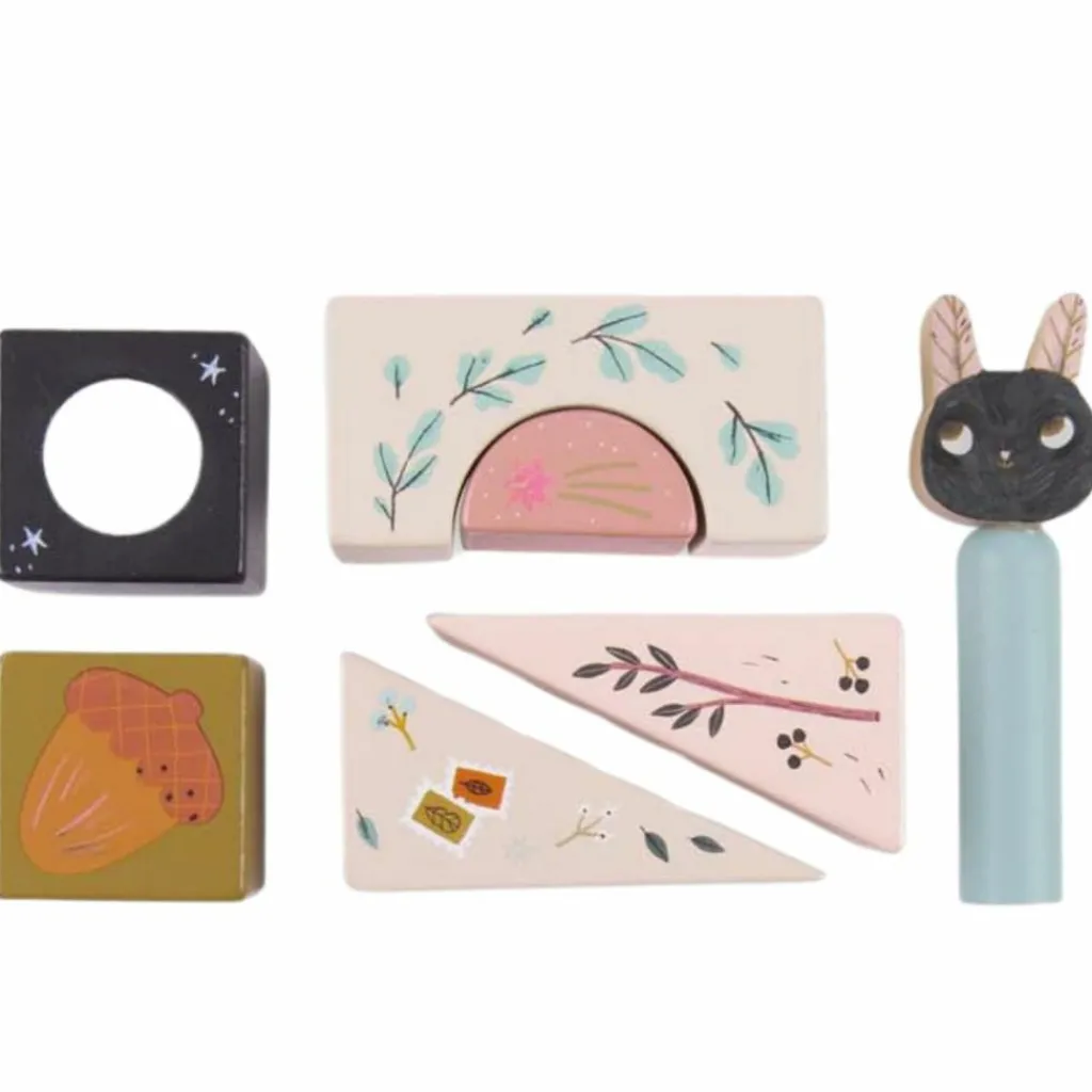 – Jeu d’activités en bois illustré de la collection Après la pluie, comprenant 13 pièces de formes différentes avec petit miroir, grelot, pop-up et petites billes.