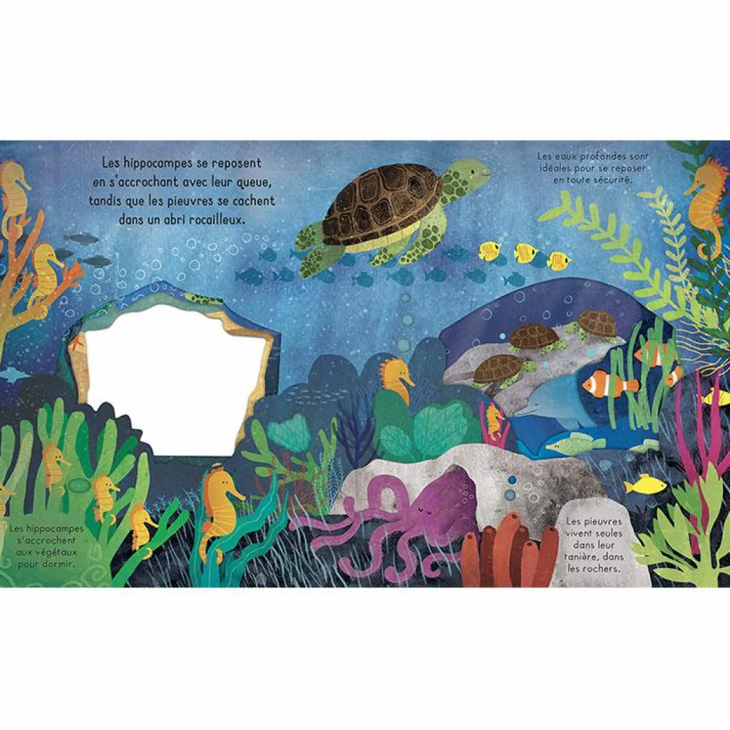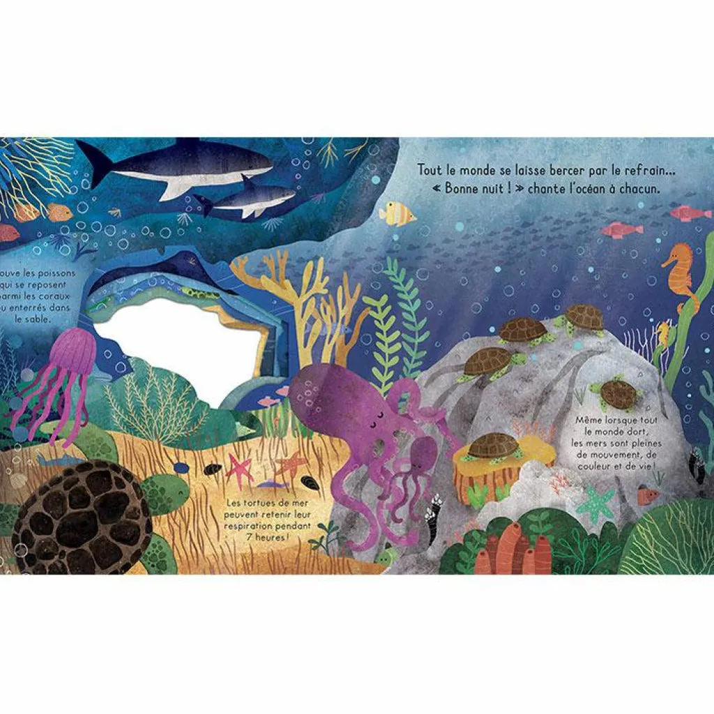 Les animaux vont se coucher… Ce livre tout-carton, avec des découpes à chaque page et superbement illustré par Carmen Saldaña, contient une petite histoire en rimes sur l’heure du coucher et des informations simples pour découvrir les animaux de l’océan.