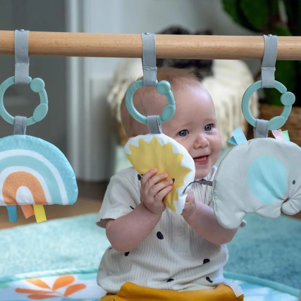 – 3 jouets inclus : un arc-en-ciel en peluche avec carillon, Van l’éléphant avec des étiquettes colorées et un miroir de soleil en tissu doux pour la découverte de soi.