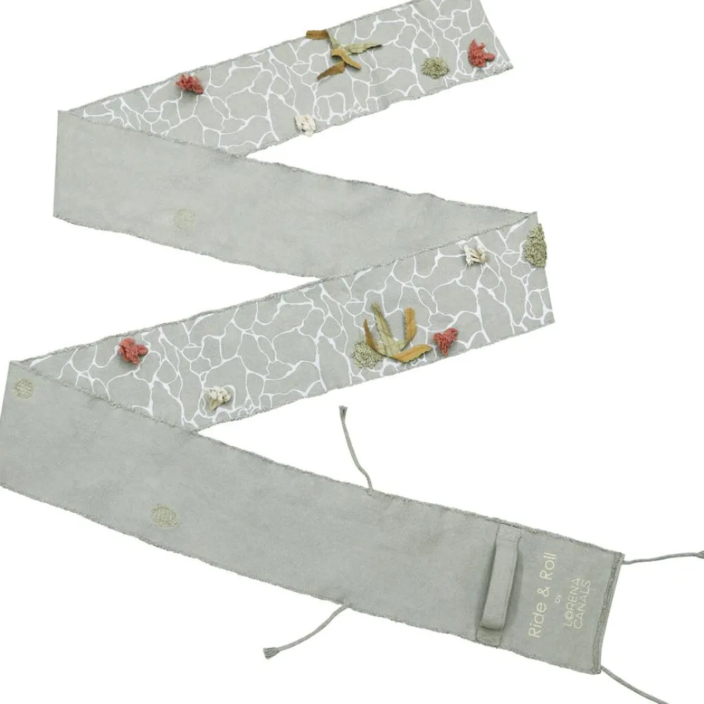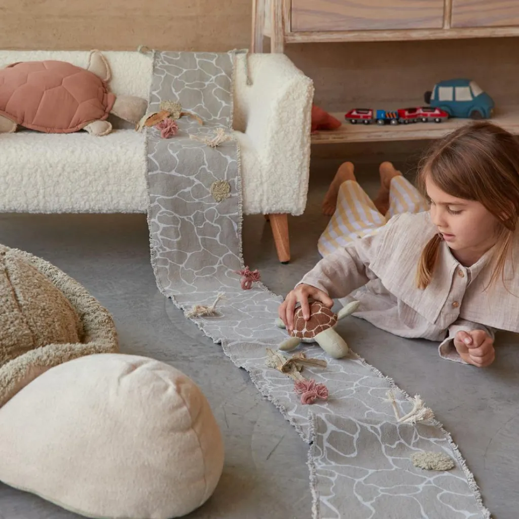 – Tortue enroulée dans un rouleau de toile de 4 mètres de long, de couleur bleu sauge, sur lequel est imprimé le monde magique du fond de la mer avec ses coraux multicolores et les reflets de l’eau.