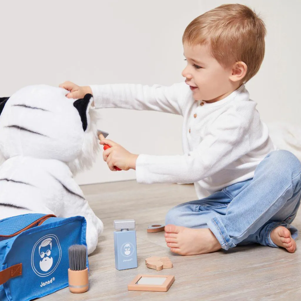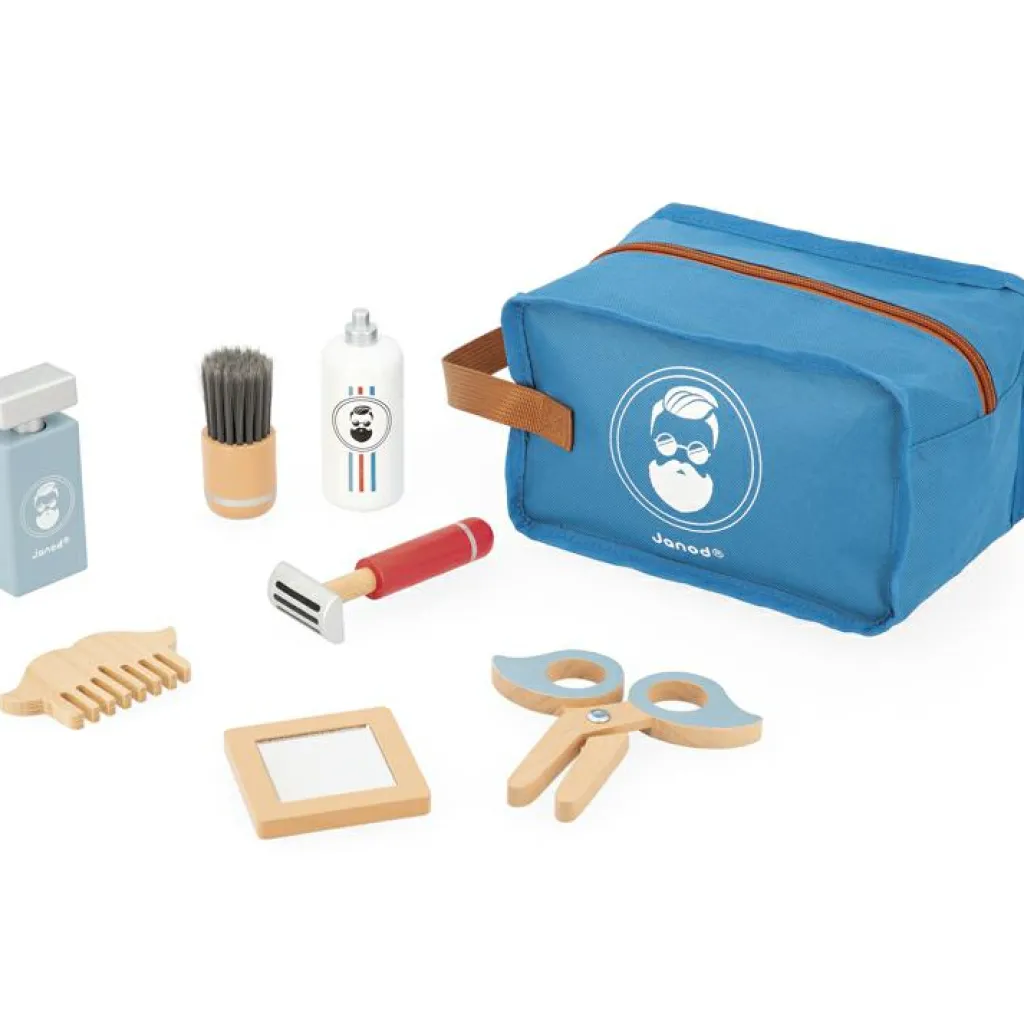– 7 accessoires en bois : 1 blaireau, 1 mousse à raser, 1 rasoir, 1 peigne, des ciseaux, 1 miroir et 1 parfum.