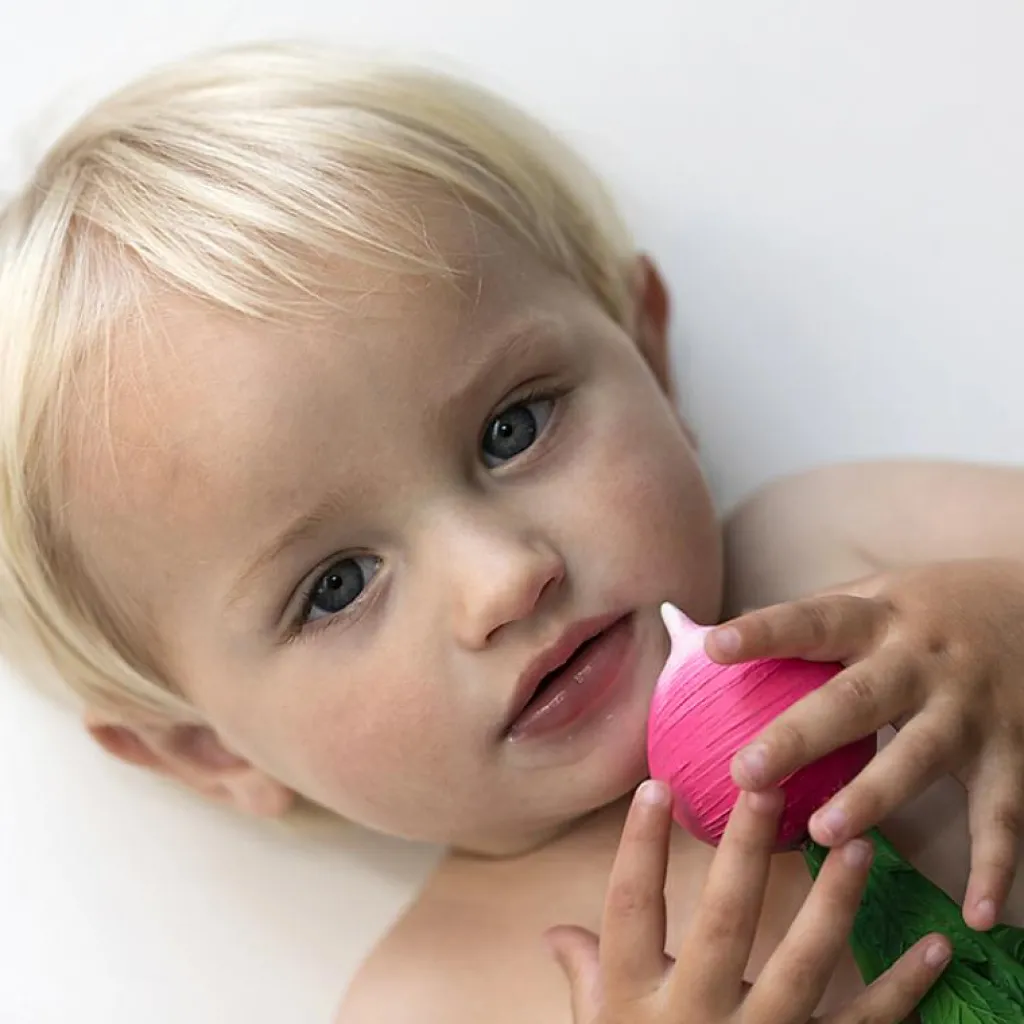 Chaque pièce est unique : modelée et peinte à la main avec des pigments naturels, sans plastique ni silicone. Sans trous, elle empêche la formation de bactéries ou de moisissures, ce qui en fait le choix le plus hygiénique pour votre enfant. Flottant sur l’eau, Ramona the Radish devient aussi un jouet de bain sûr et ludique. Facile à saisir par les petites mains, elle accompagnera bébé dans tous ses moments de jeu.