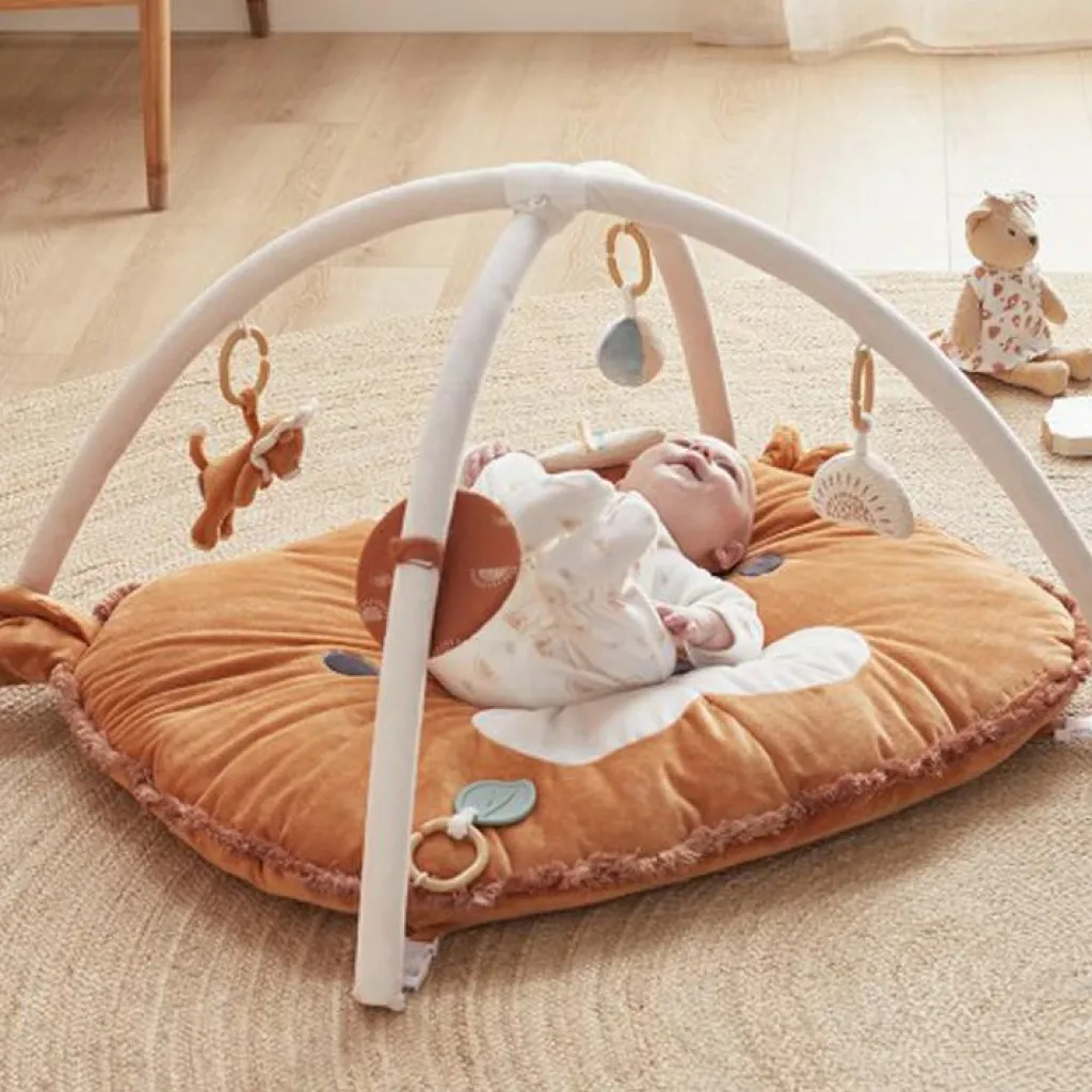– Différentes matières, sons et activités : miroir, pouët, papier froissé, grelot, hochet, jouet de dentition.