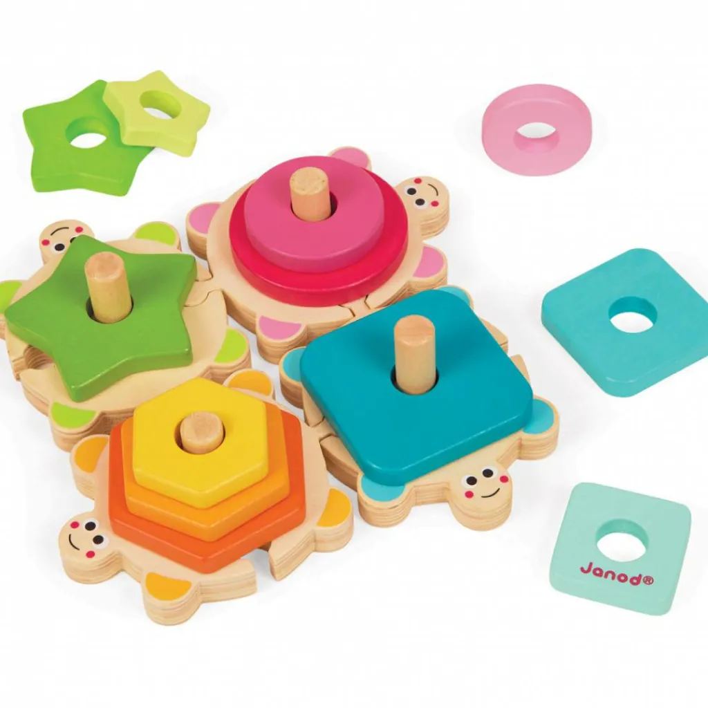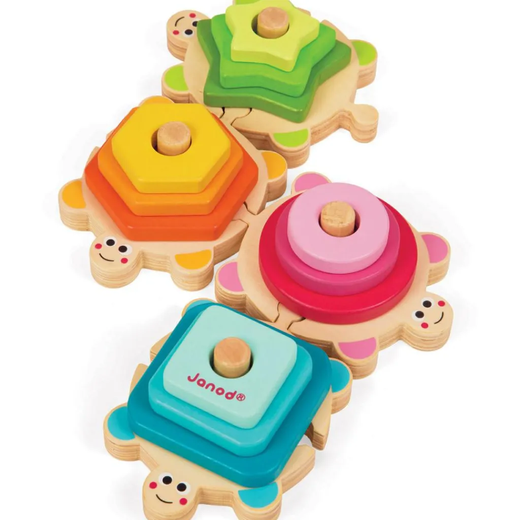 Ce jeu tortues à empiler I wood de la marque Janod permet à l’enfant d’apprendre les couleurs et les formes tout en s’amusant.