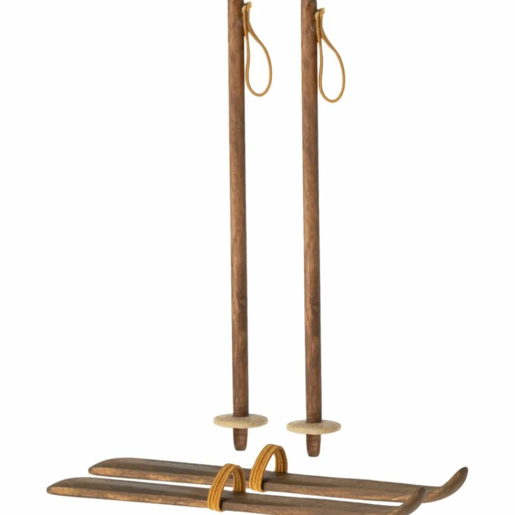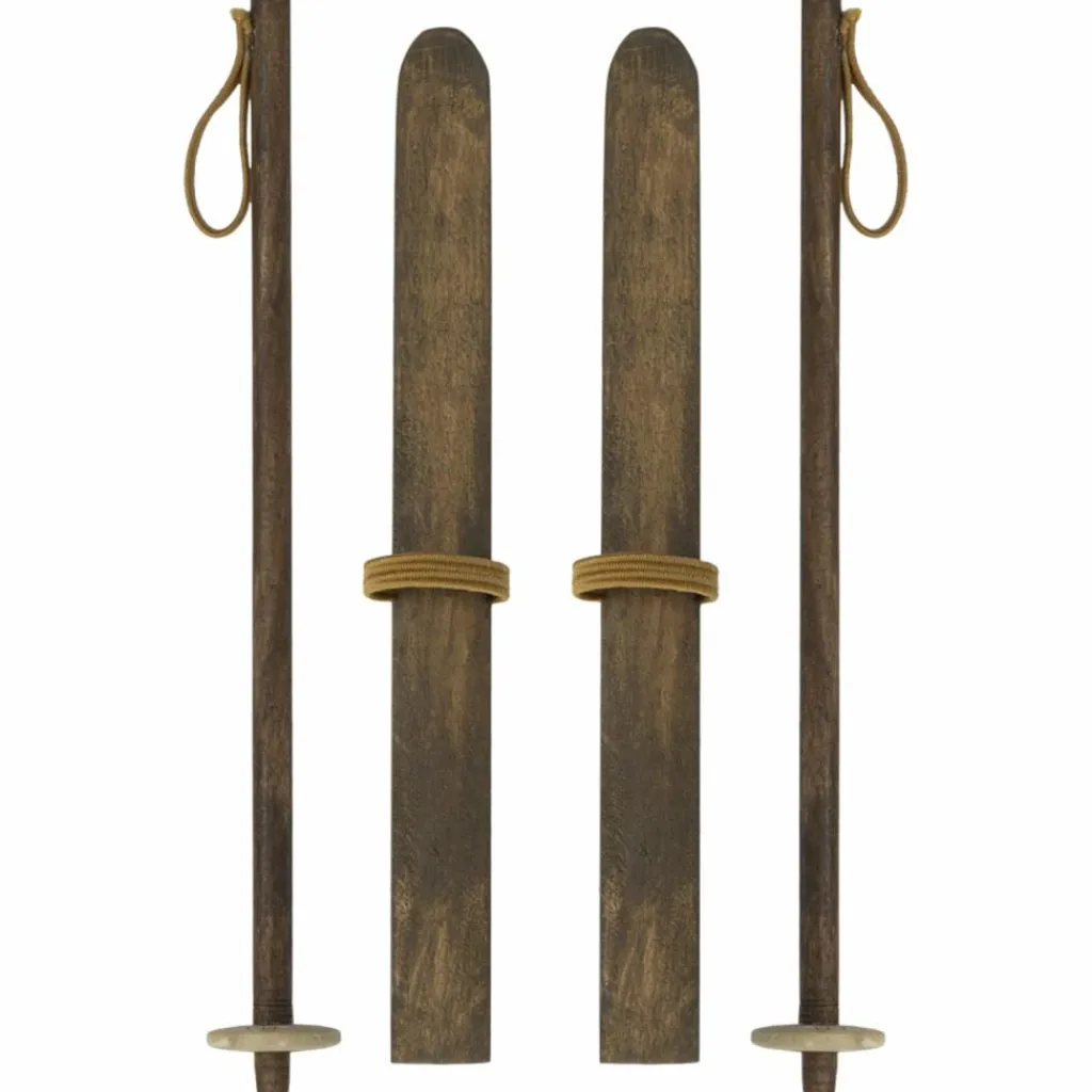 – Les skis et bâtons sont en bois et l’élastique permet d’être facilement fixé à leurs pieds et mains.