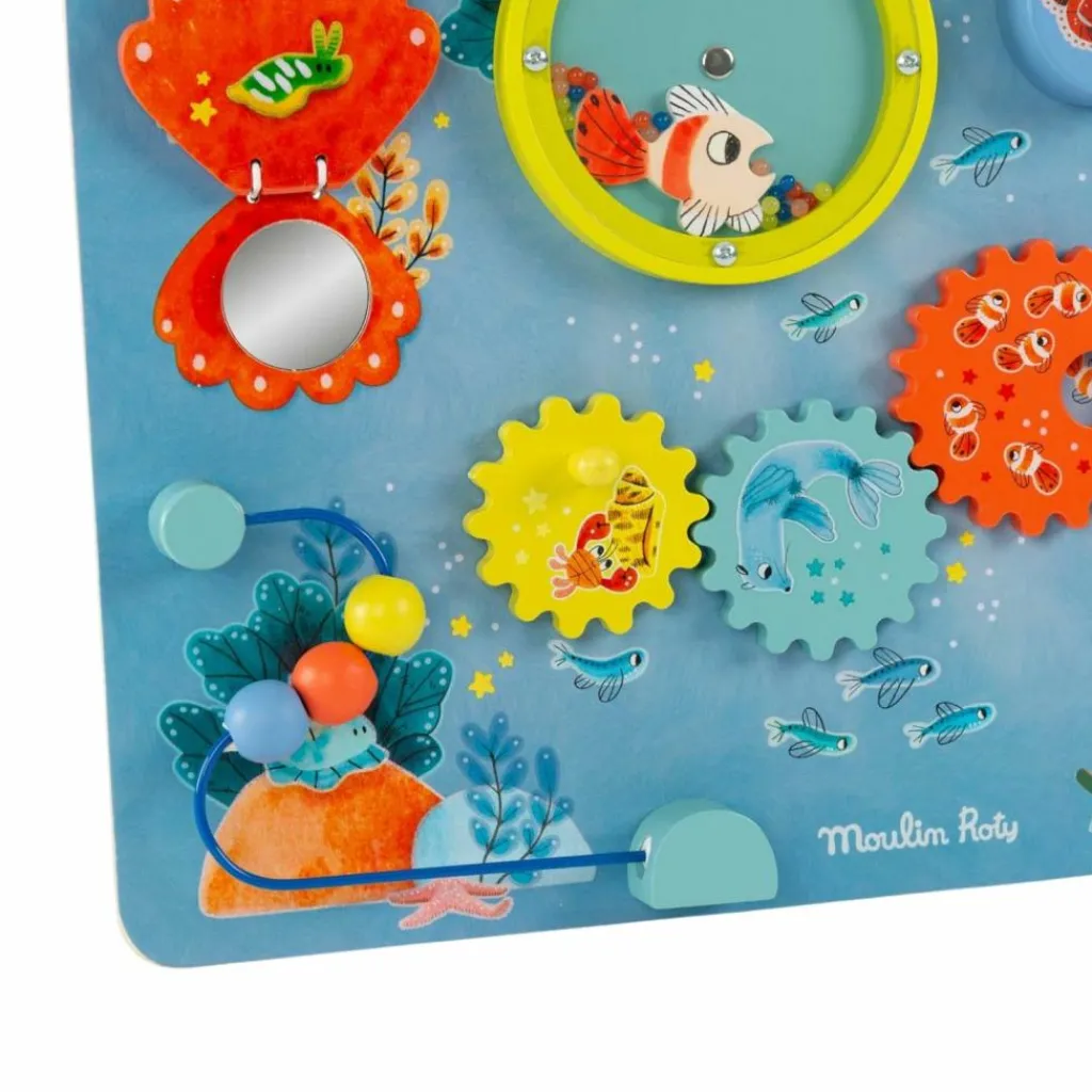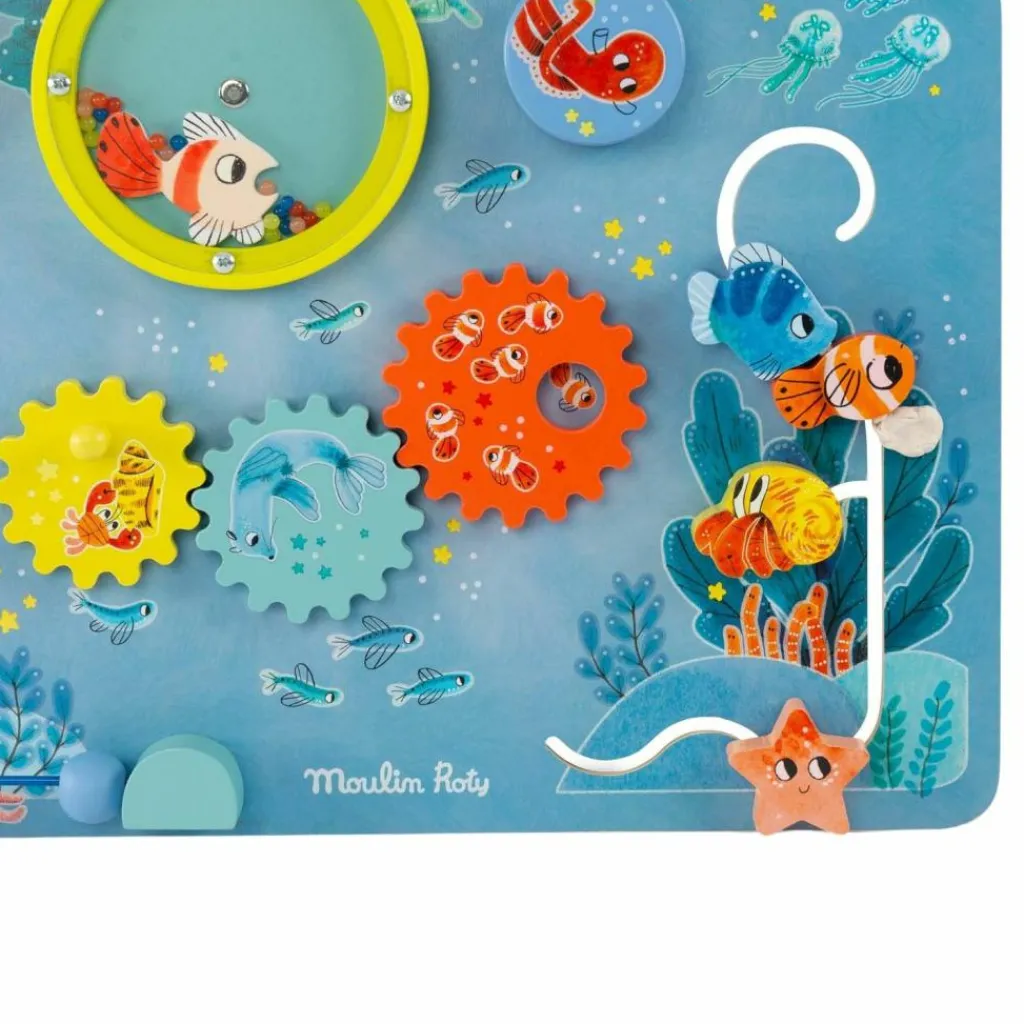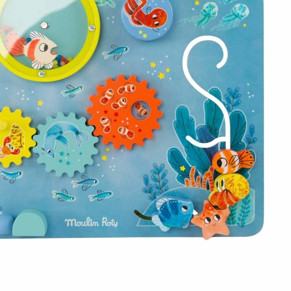 – Panneau d’activités en bois aux couleurs de l’océan.