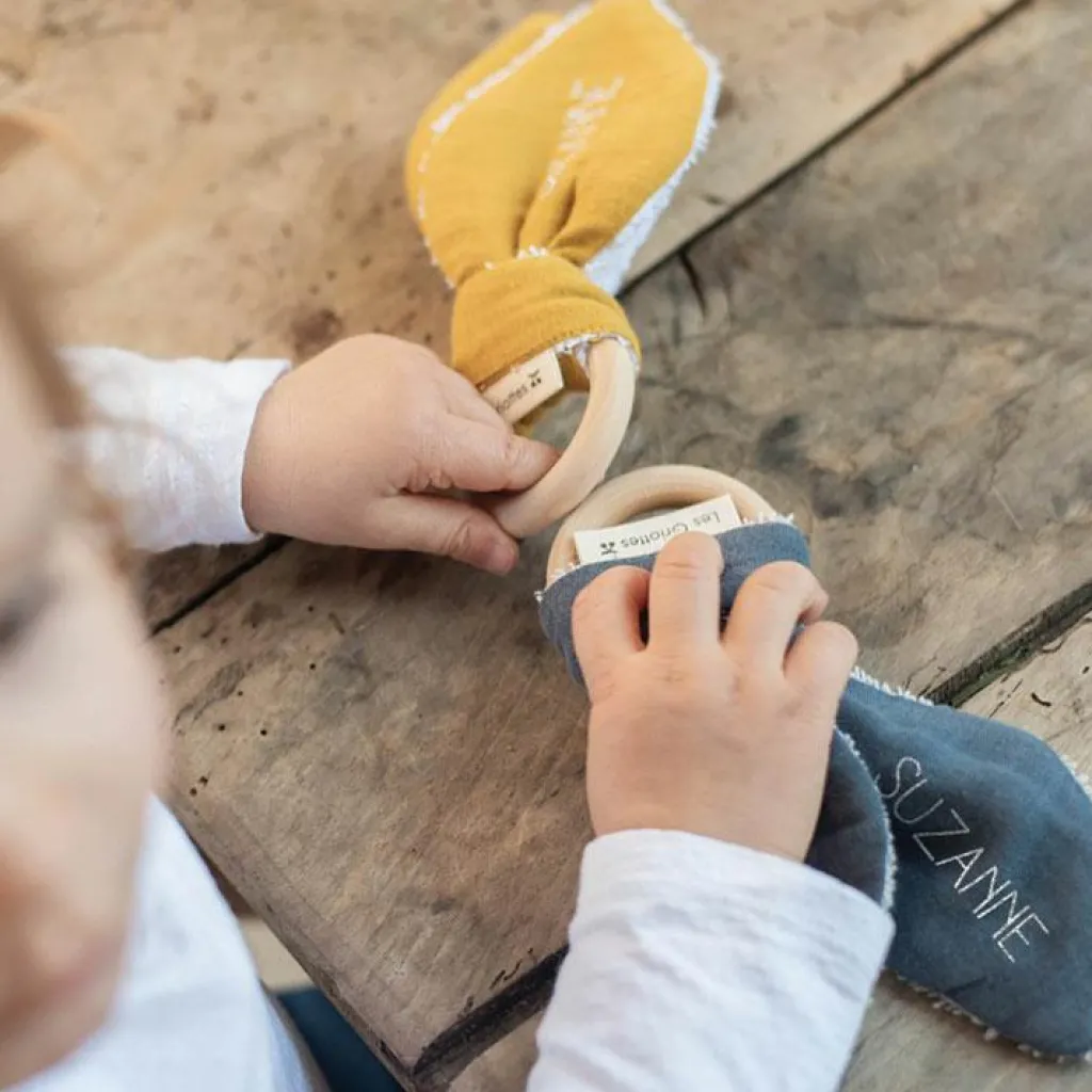 Conçu pour accompagner les premières poussées dentaires de bébé, cet anneau de dentition associe la solidité naturelle du bois de hêtre non traité à la douceur réconfortante de la gaze de coton. Sa forme rigolote en oreilles de lapin amuse les tout-petits tout en leur offrant une prise en main facile.
