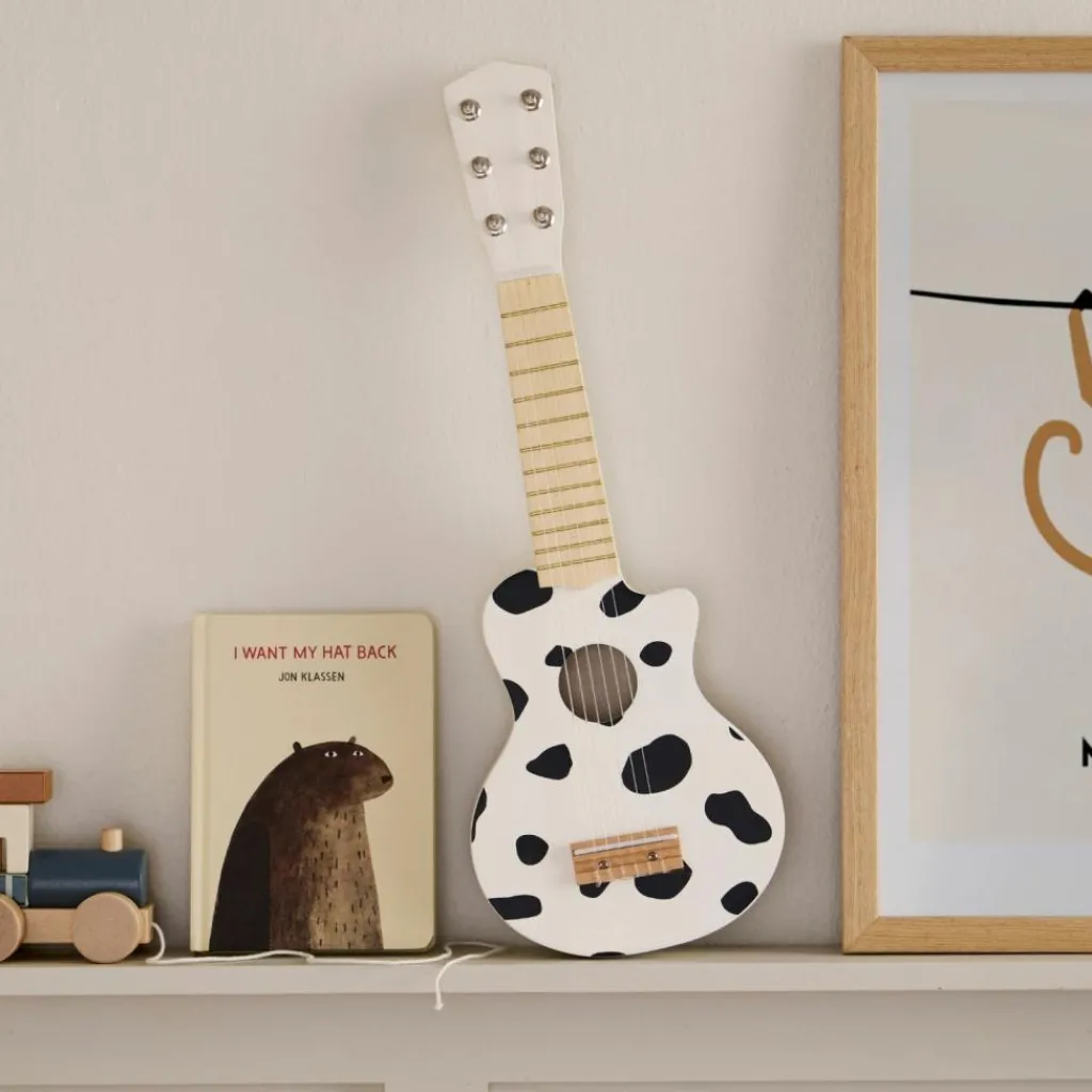 Avec son imprimé noir façon taches de vache sur fond blanc, cette guitare ne passe pas inaperçue. Elle invite les tout-petits à s’exprimer à travers la musique, en solo ou lors de mini-concerts organisés dans leur chambre. Facile à prendre en main, elle permet de s’initier aux sons et au rythme tout en stimulant la créativité.