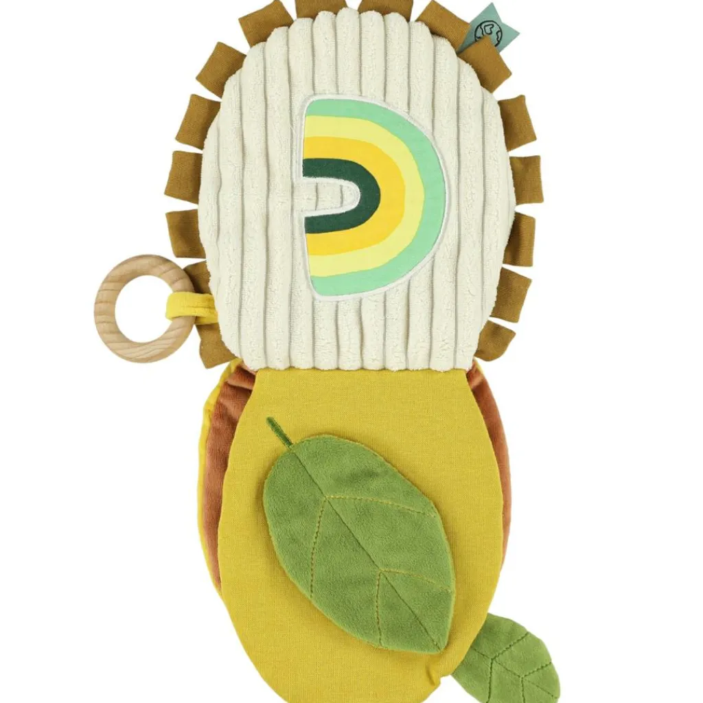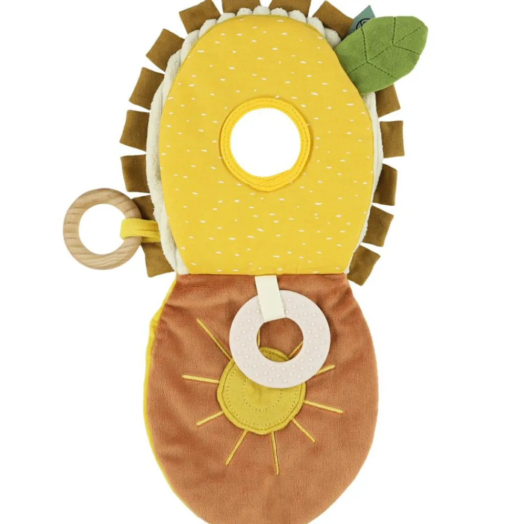 – Multiples fonctionnalités qui stimulent la vue, l’ouïe, le toucher et la préhension (anneau de dentition, miroir, papier froissé, etc.).