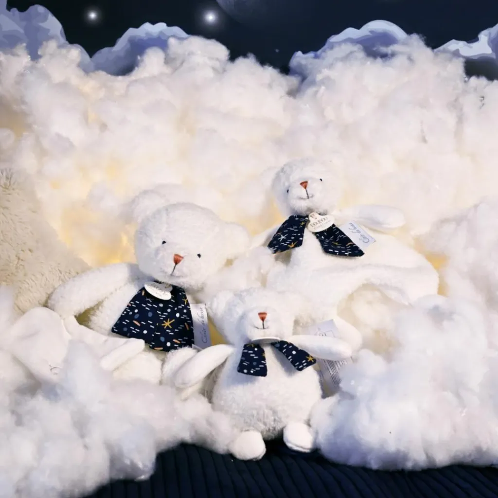 Ce tendre compagnon en tissu frisé blanc ultra-doux deviendra vite le confident préféré de bébé. Grâce à sa matière luminescente, il diffuse une lumière douce et apaisante dès que la chambre s’assombrit. Un repère rassurant pour votre enfant qui se sentira en sécurité, même dans le noir.