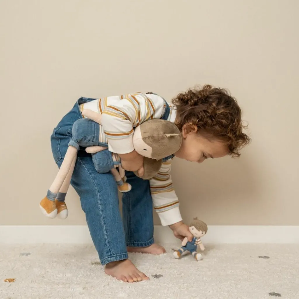 – Jim peut tenir assis et aime t’accompagner dans la poussette pour poupée en bois de Little Dutch.