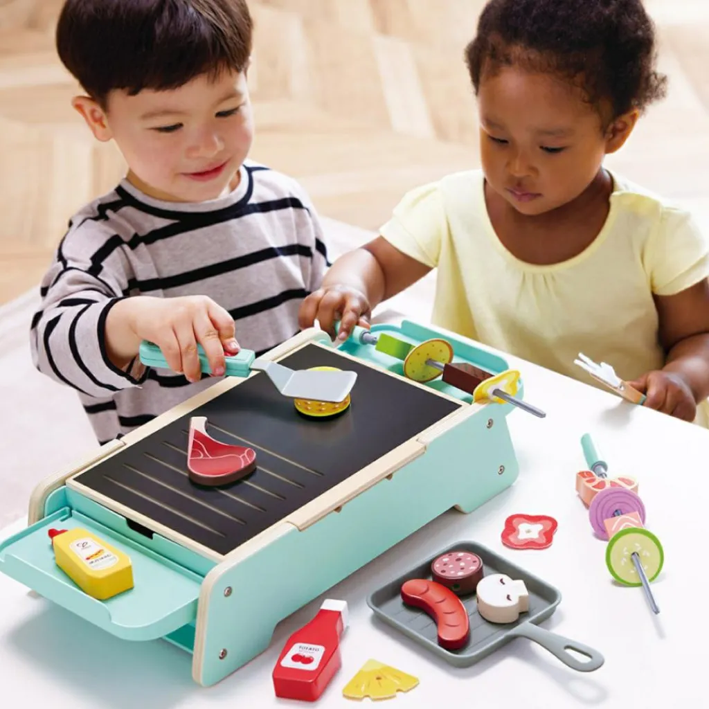 – 24 accessoires dont 1 spatule, 1 pince, 1 brosse, 1 plateau, 1 salière, 1 poivrière, des saucisses, des côtelettes d’agneau, du saumon, etc.