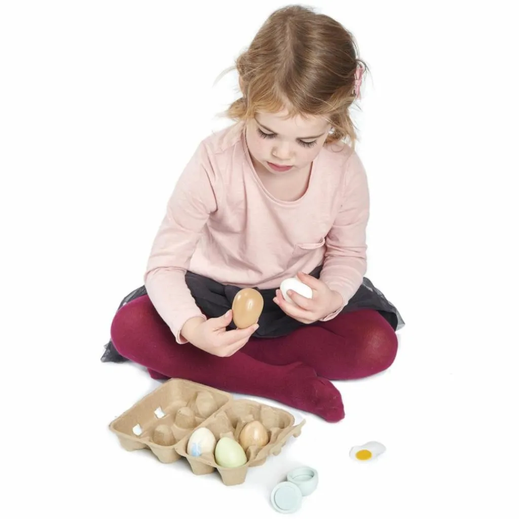 – Six jolis petits œufs en bois massif dans une authentique boîte à œufs.