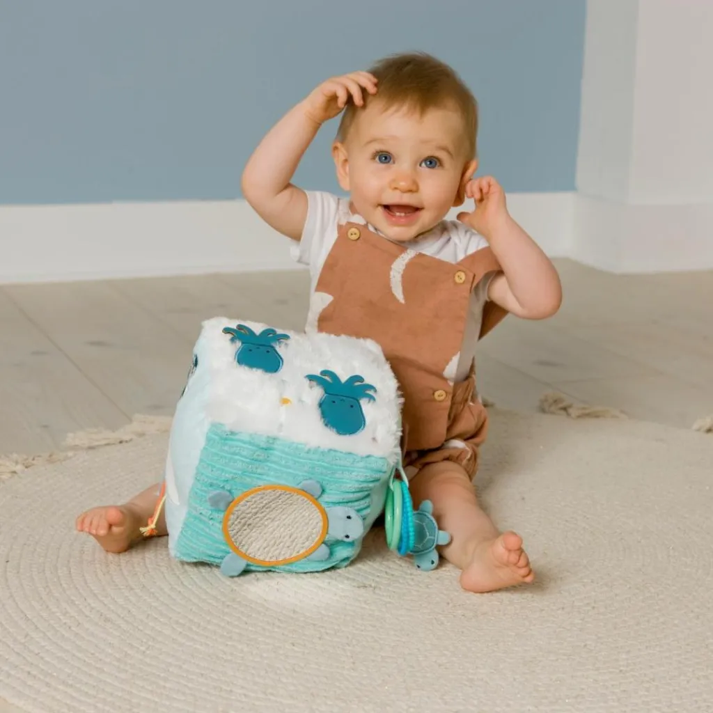 – Plusieurs activités : hochets, jeux de matières, tortue miroir pour y découvrir son reflet, matières ultra douces, détails brodés, 2 anneaux de dentition, petite tortue qui se cache dans le coquillage, tentacules de la pieuvre mobiles.