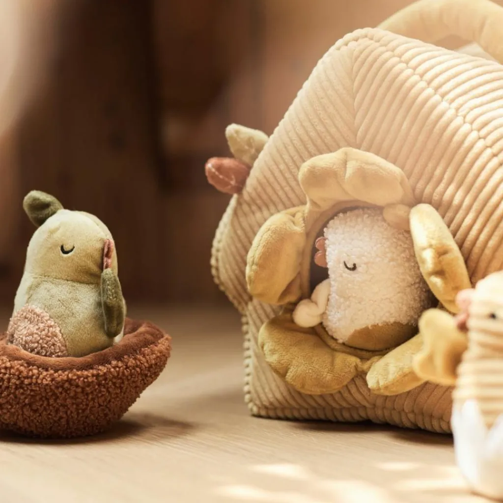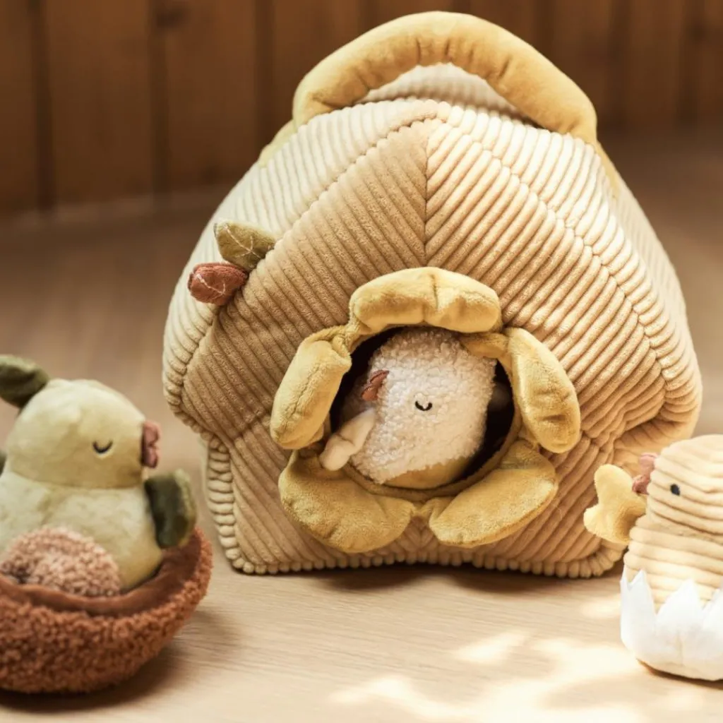 Un monde miniature dans un jouet : La maisonnette en velours côtelé, décorée de feuilles et d’une ouverture fleurie, transforme chaque session de jeu en une parenthèse enchantée. Cache-cache, bruitages, manipulations… ce jouet devient vite un incontournable du quotidien des petits curieux.