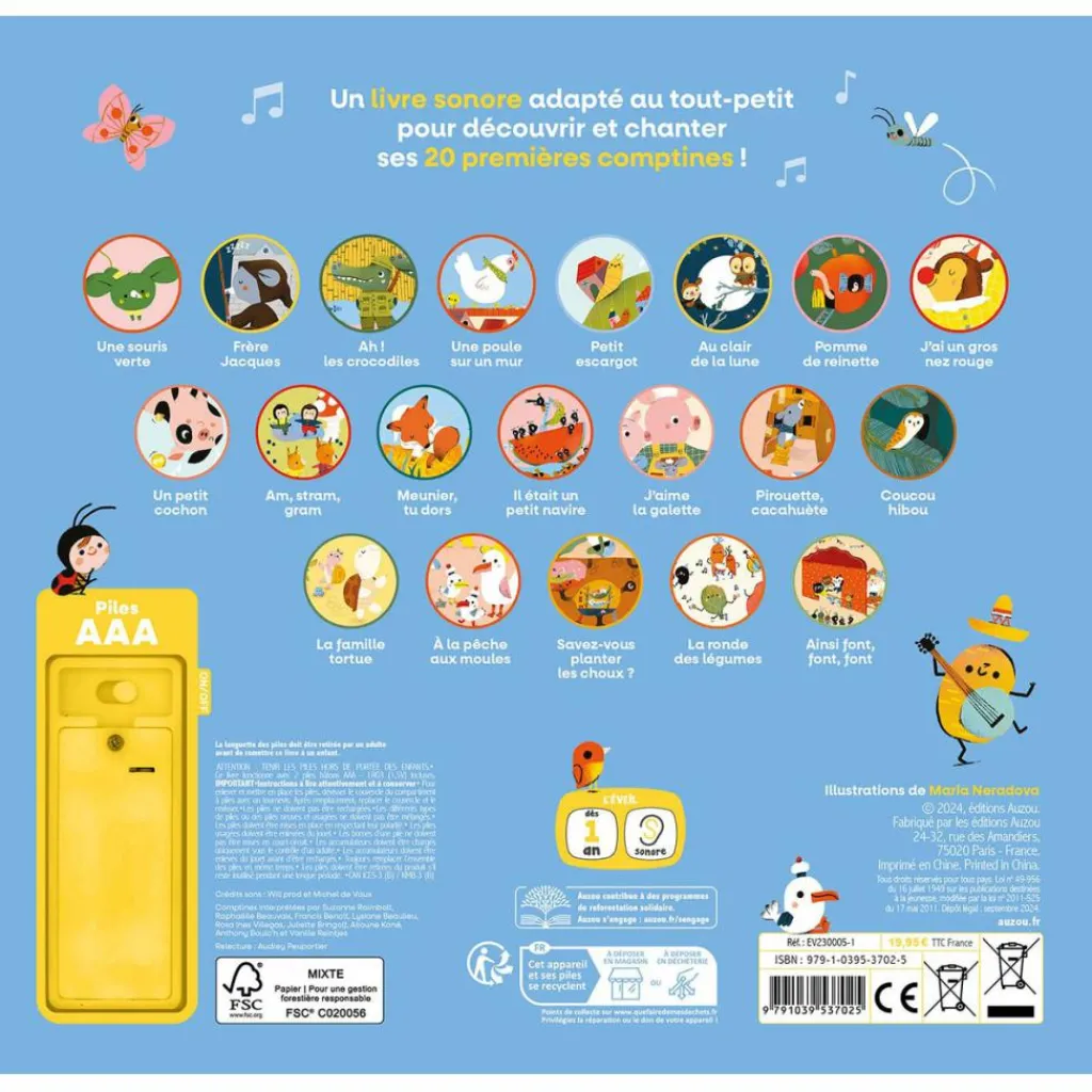 – 1 livre tout carton avec 20 comptines célèbres illustrées (avec les paroles pour chanter).