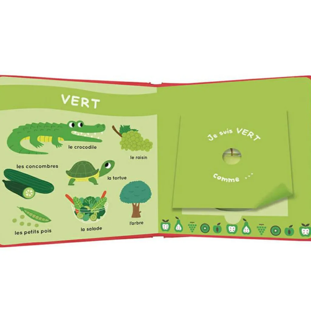 Que se cache-t-il derrière le rabat ? En frottant son doigt, l’enfant y découvrira une odeur que l’on trouve sur l’étal de fruits de la couleur de la page.
