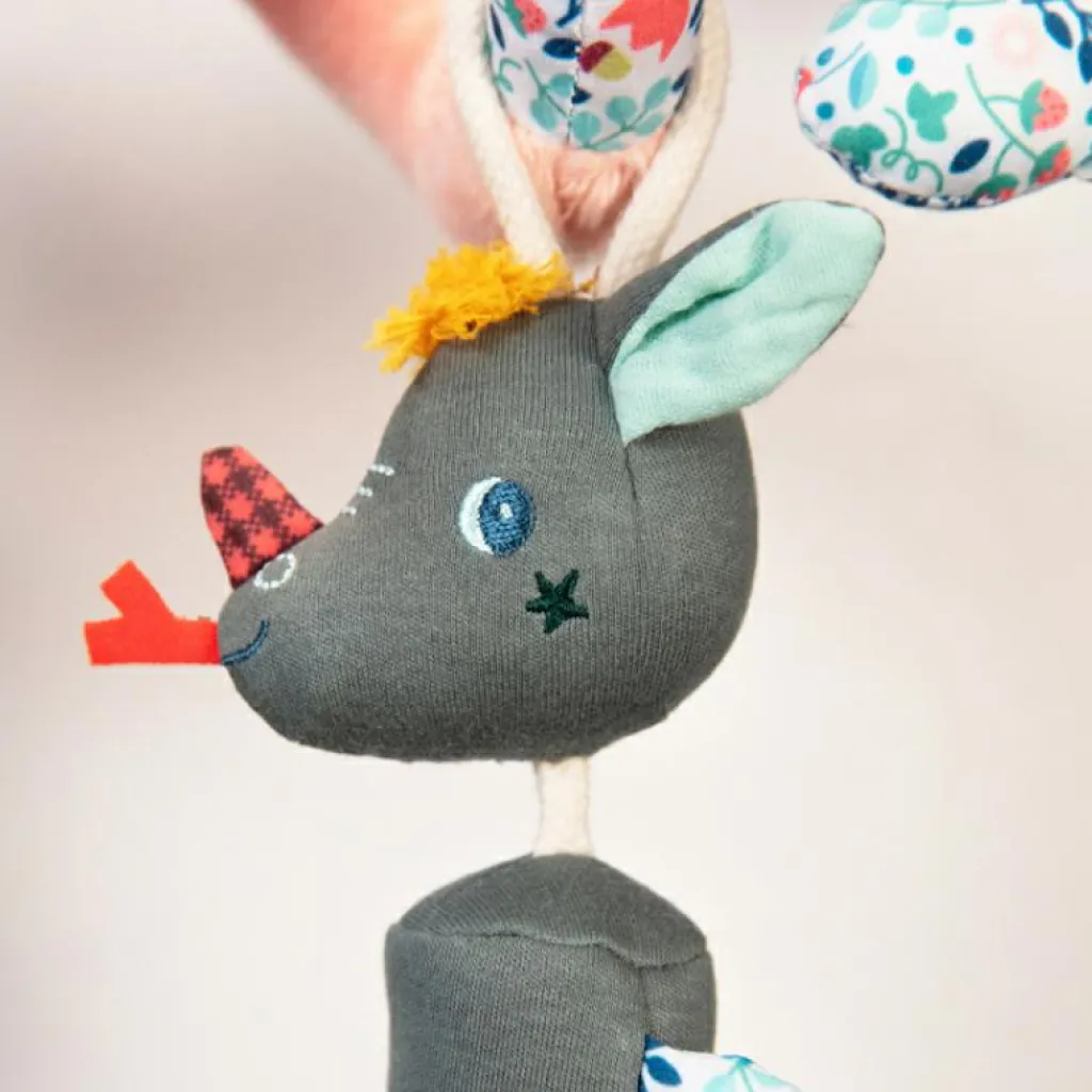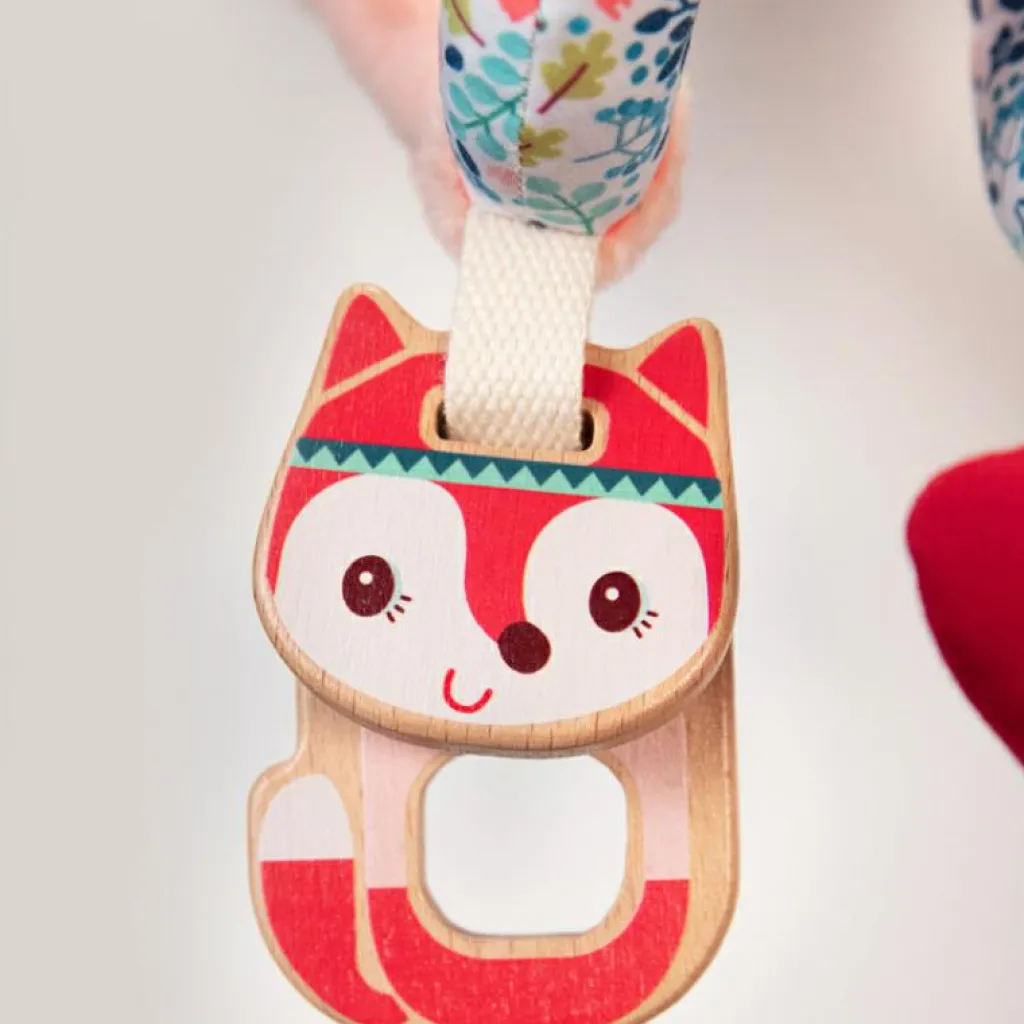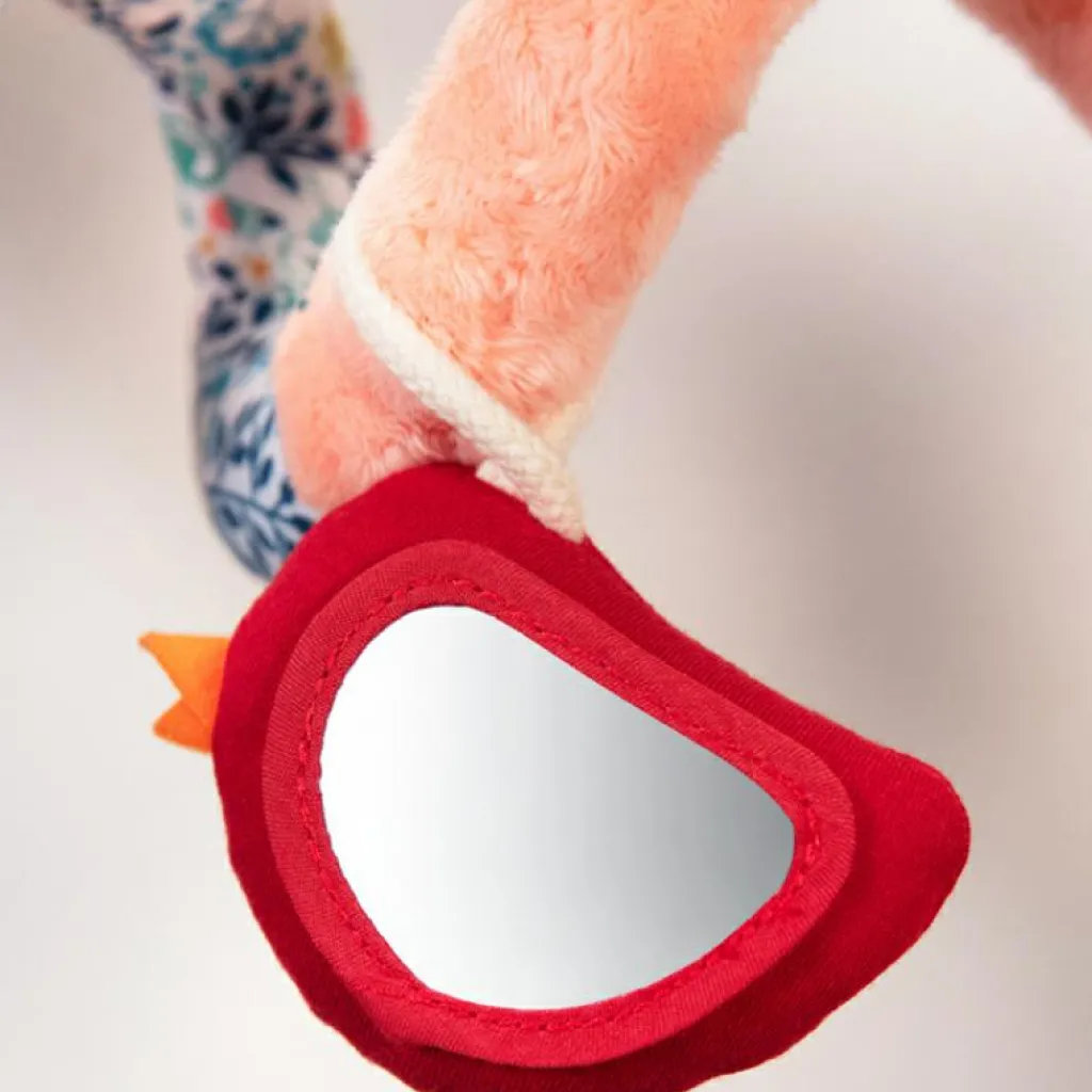 – Plusieurs activités et sons à découvrir : hochet en bois, pouët, miroir…