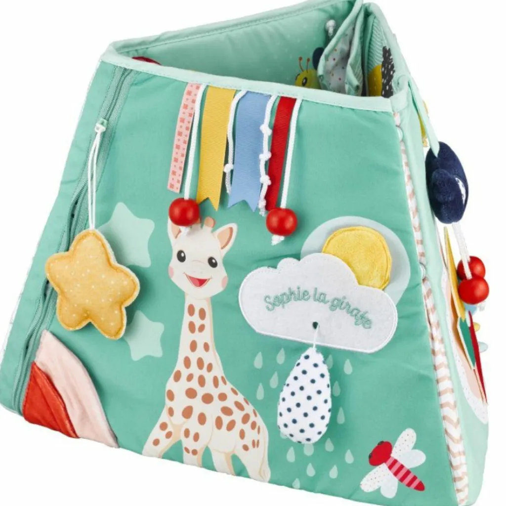 – Assis : plié en 3 parties, le tableau tient debout et bébé a toutes les activités à porté de mains pour les découvrir à son rythme et développer ainsi sa motricité fine.