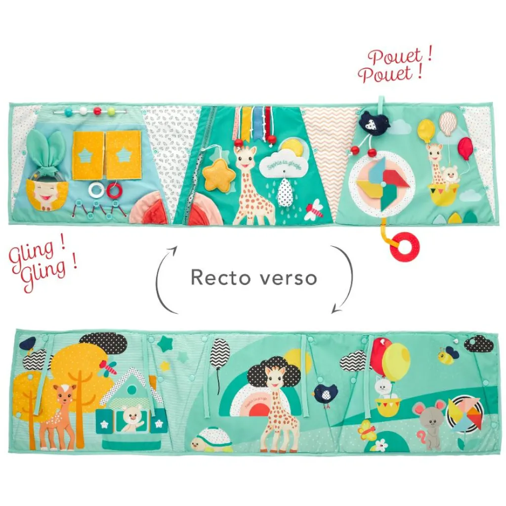 – Couché sur le dos : dès la naissance, le tableau s’accroche aux barreaux du parc pour éveiller la vue de bébé.