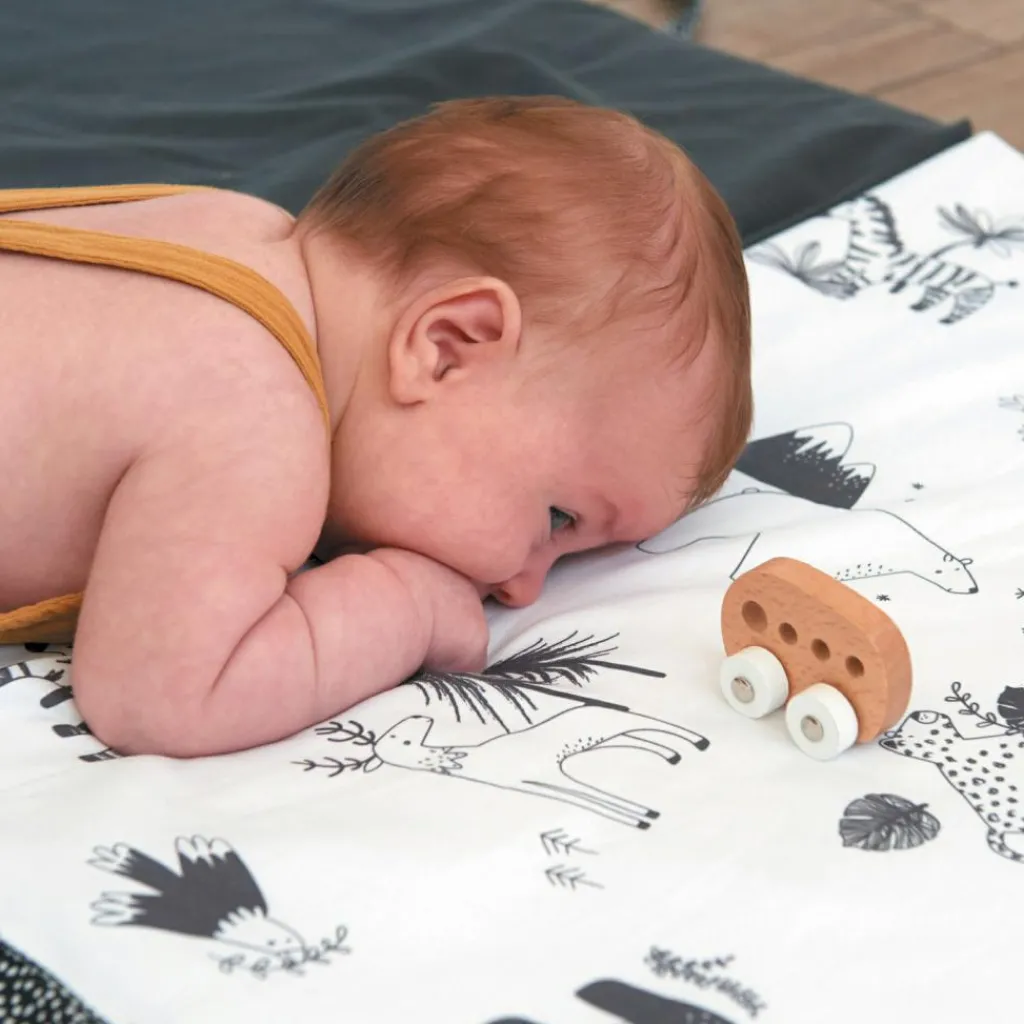 Le tapis de jeu pliable 3 en 1 Black & white experience de la marque Candide est un accessoire multifonctions très pratique. Il peut être utilisé comme tapis de jeu, mais également comme matelas d’appoint ou comme pouf !