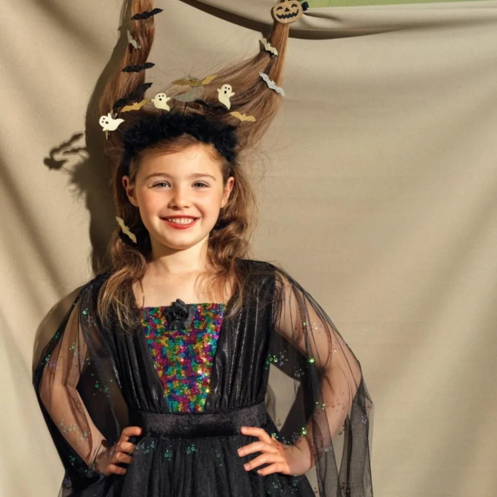 Parfait pour Halloween, les fêtes costumées ou les goûters d’enfants, ce serre-tête noir orné de petites plumes et décoré de fantômes, chauve-souris et lune scintillante promet un look à la fois rigolo et effrayant. Facile à porter, il se place confortablement sur la tête et assure une allure festive instantanée.