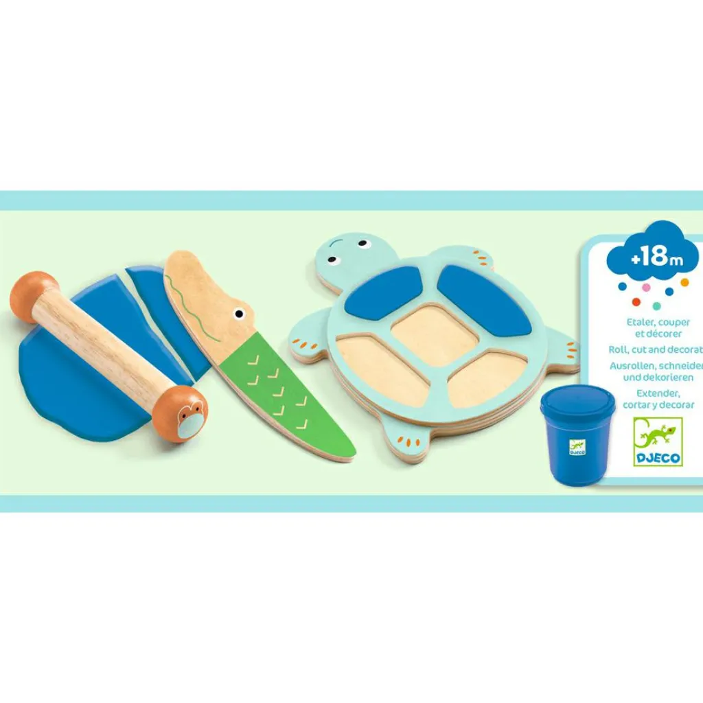– L’enfant étale, coupe la pâte à modeler pour décorer la tortue.