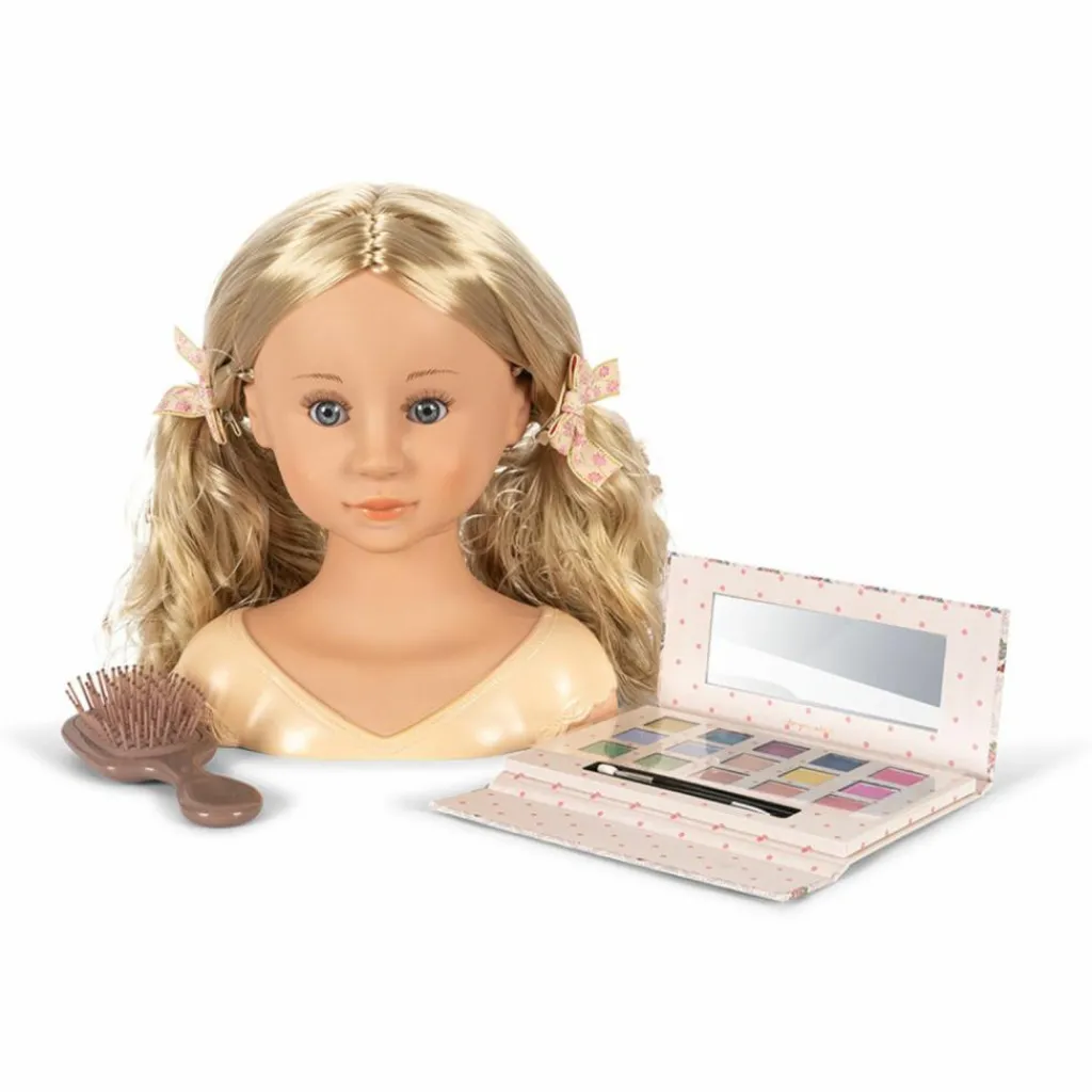 Cette jolie tête d’entraînement est parfaite pour les enfants qui aiment jouer aux coiffeurs et aux maquilleurs. Avec ses cheveux blonds soyeux faciles à coiffer, son visage doux et réaliste, ainsi que les accessoires inclus (brosse, palette de maquillage avec miroir), elle invite à des heures de jeu créatif. Votre enfant pourra inventer des coiffures, tester des maquillages colorés et s’imaginer dans un véritable institut de beauté.