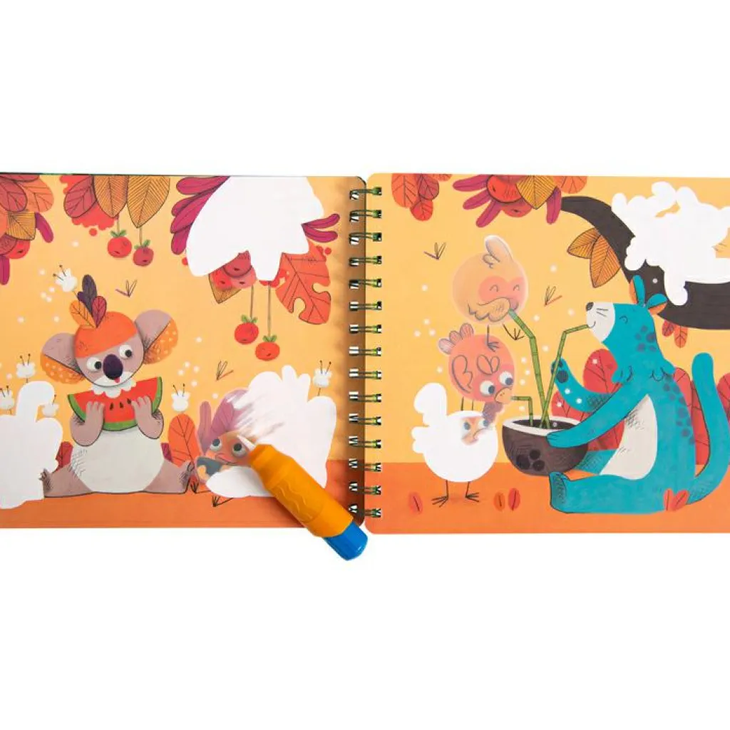 – Grâce au pinceau à eau, peindre les zones blanches sur chaque page pour faire apparaître les illustrations exotiques.