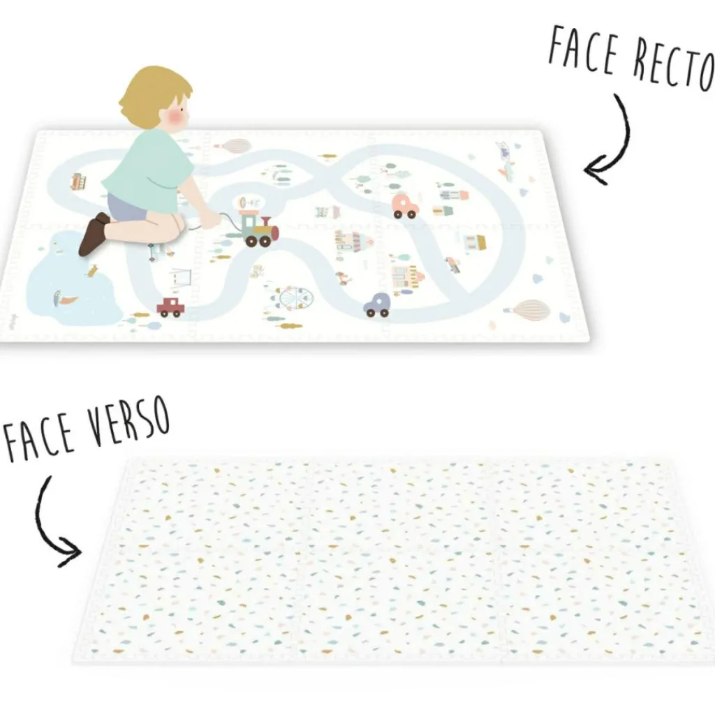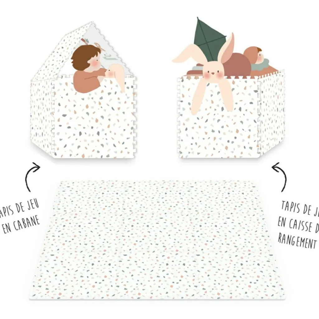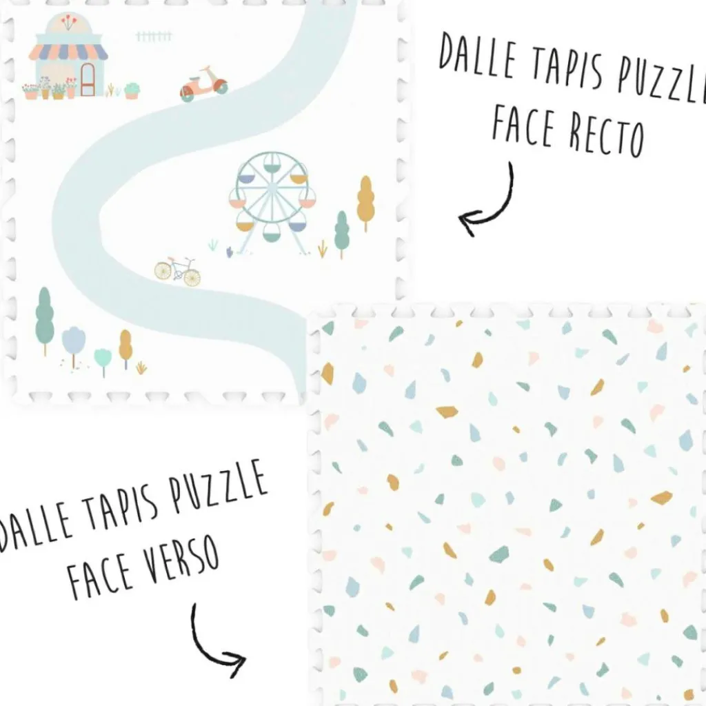 – 2 en 1 : tapis de jeu puzzle, boîte de rangement.