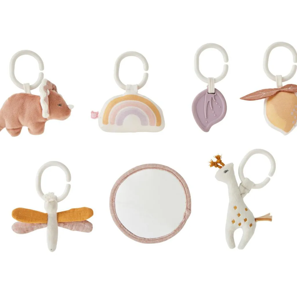 – Différentes matières, sons et activités : miroir, pouët, papier froissé, grelot, hochet, jouet de dentition.