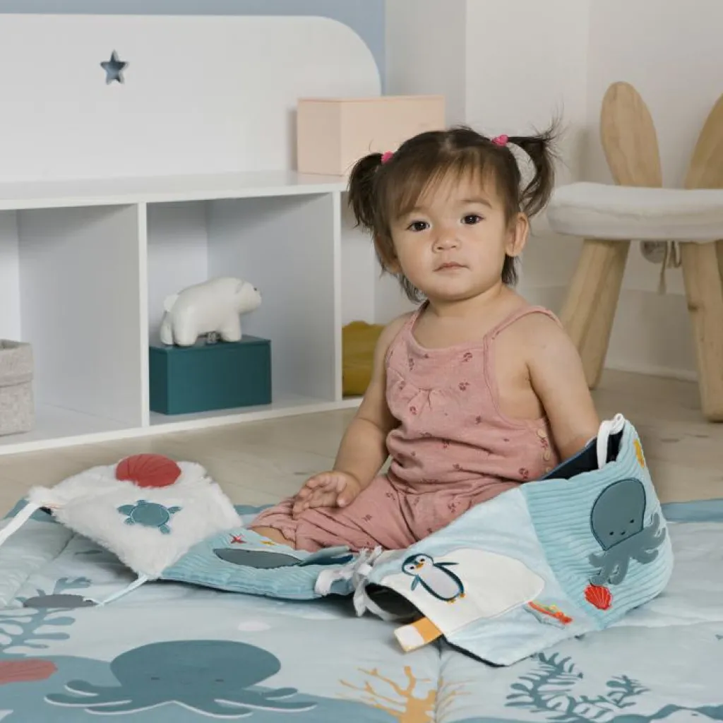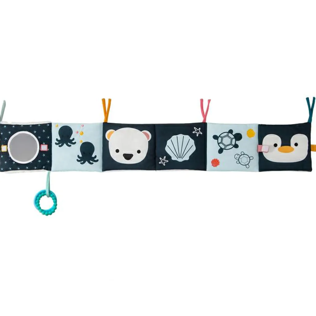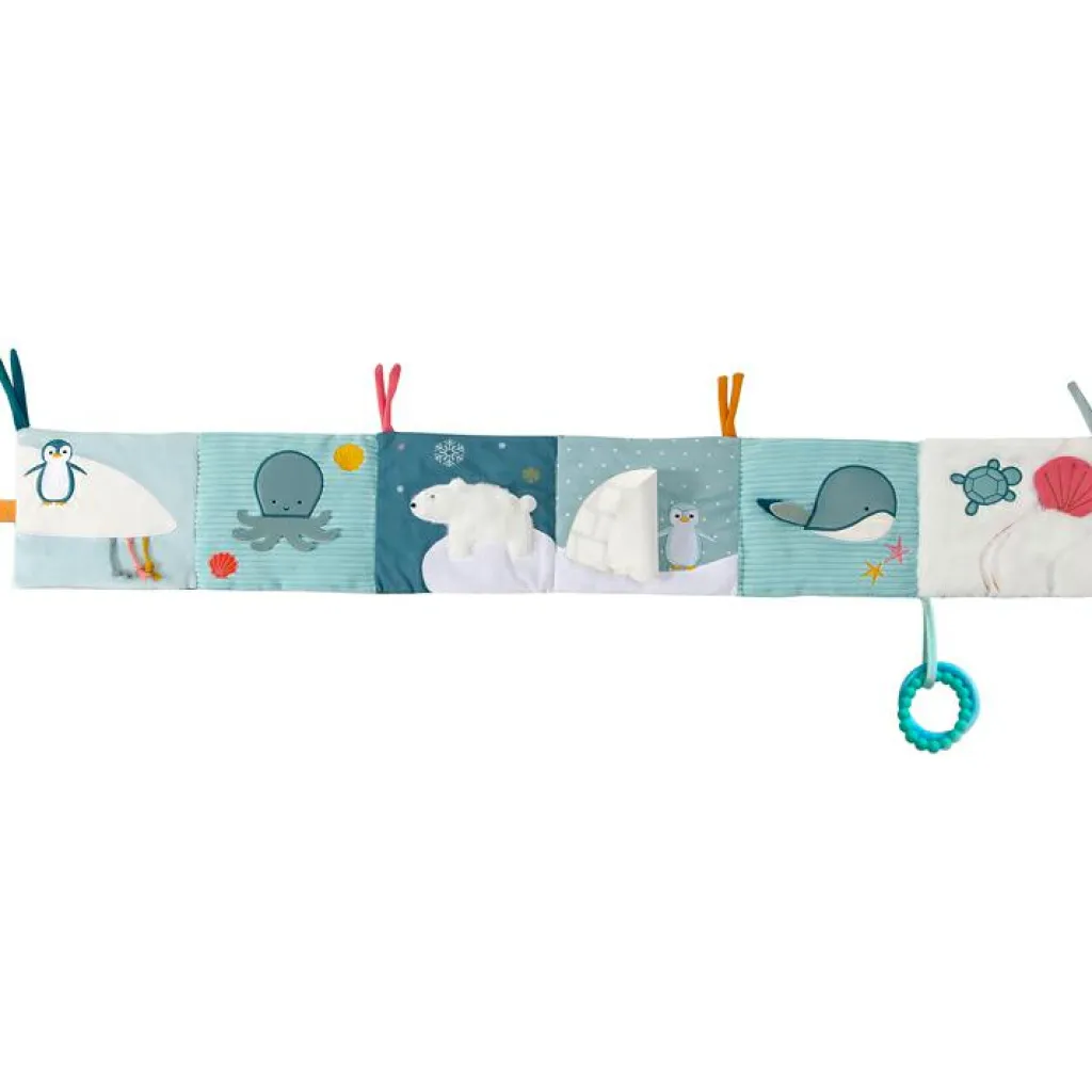 – Activités intégrées : 3 cordons, un ours couineur, un pingouin qui se cache, 2 anneaux de dentition, une pieuvre dont les tentacules sont mobiles.
