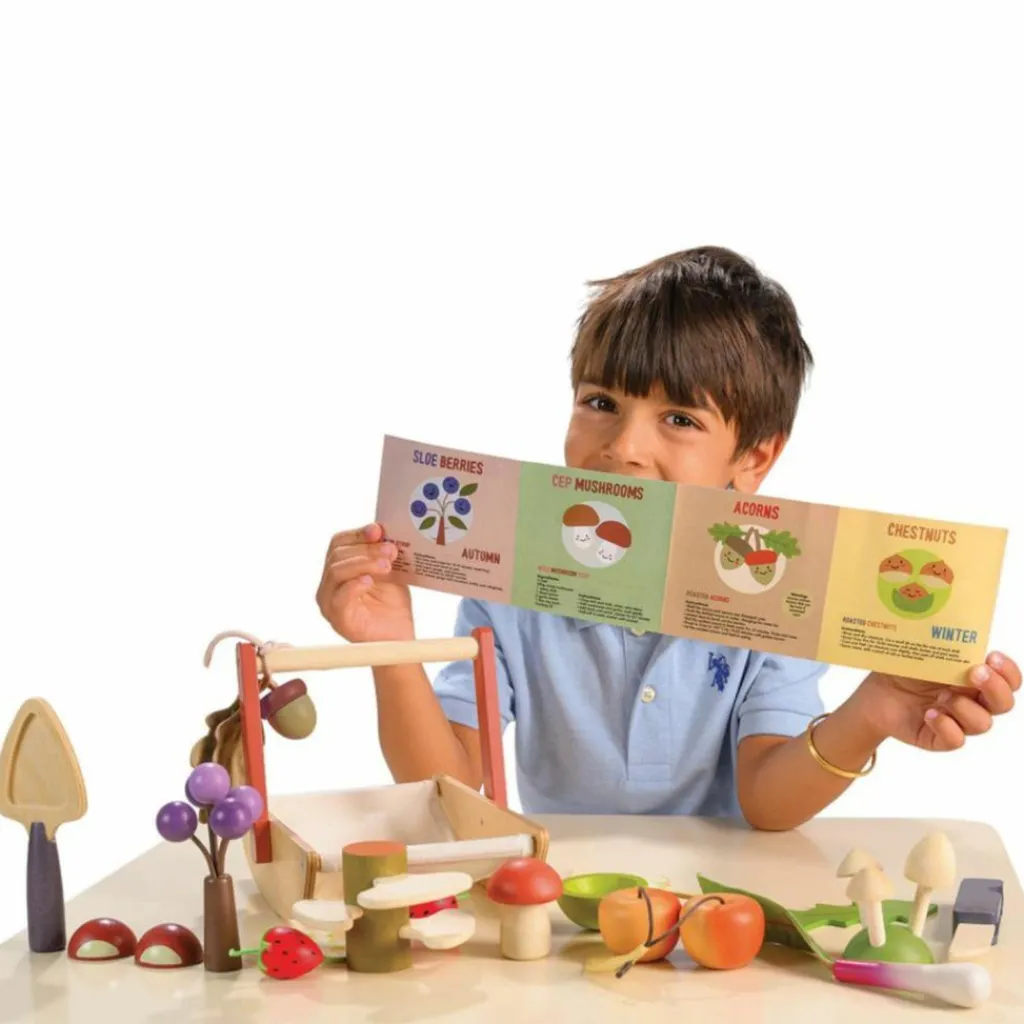 – Un coffret complet : Contient fruits, baies, champignons et fleurs en bois à cueillir et manipuler.