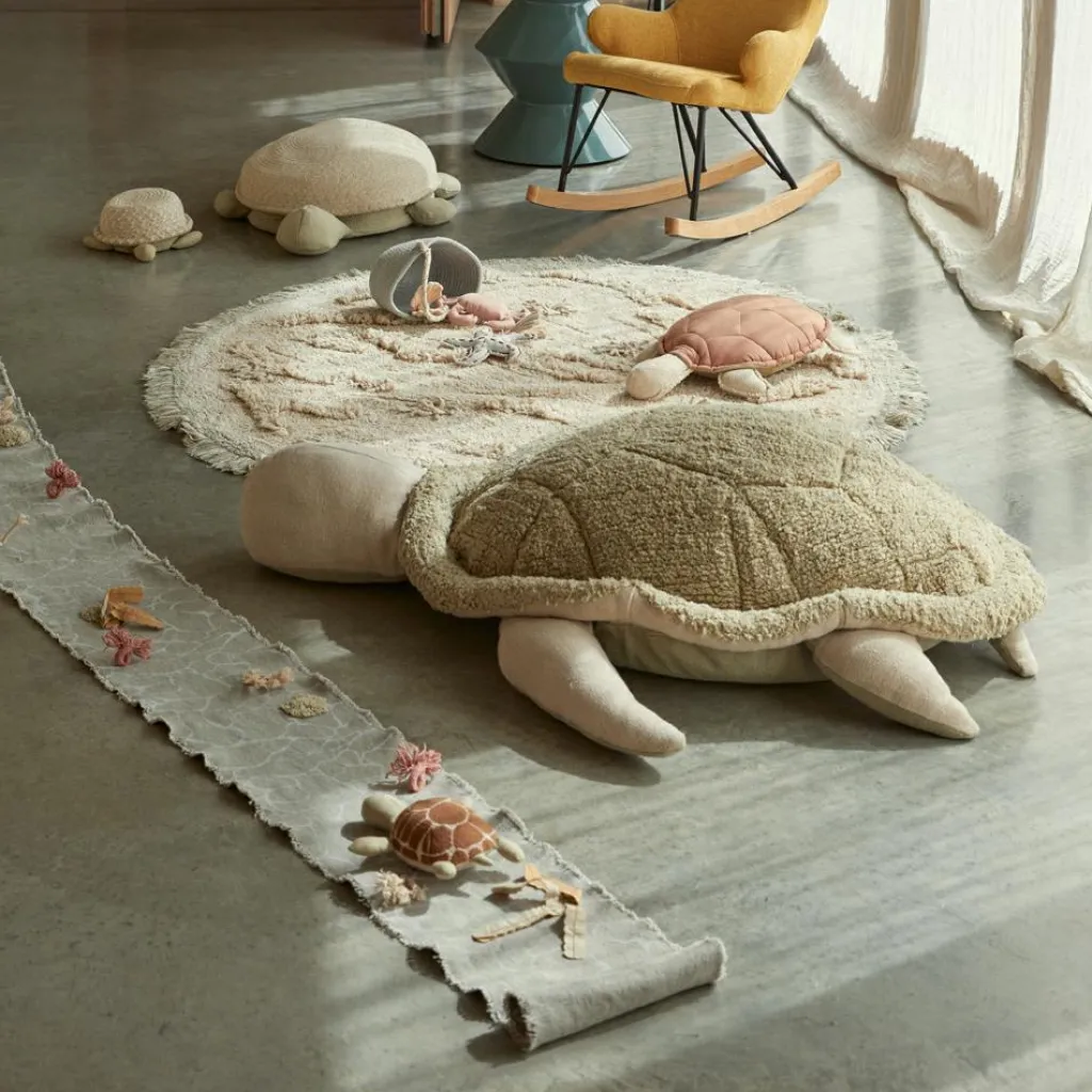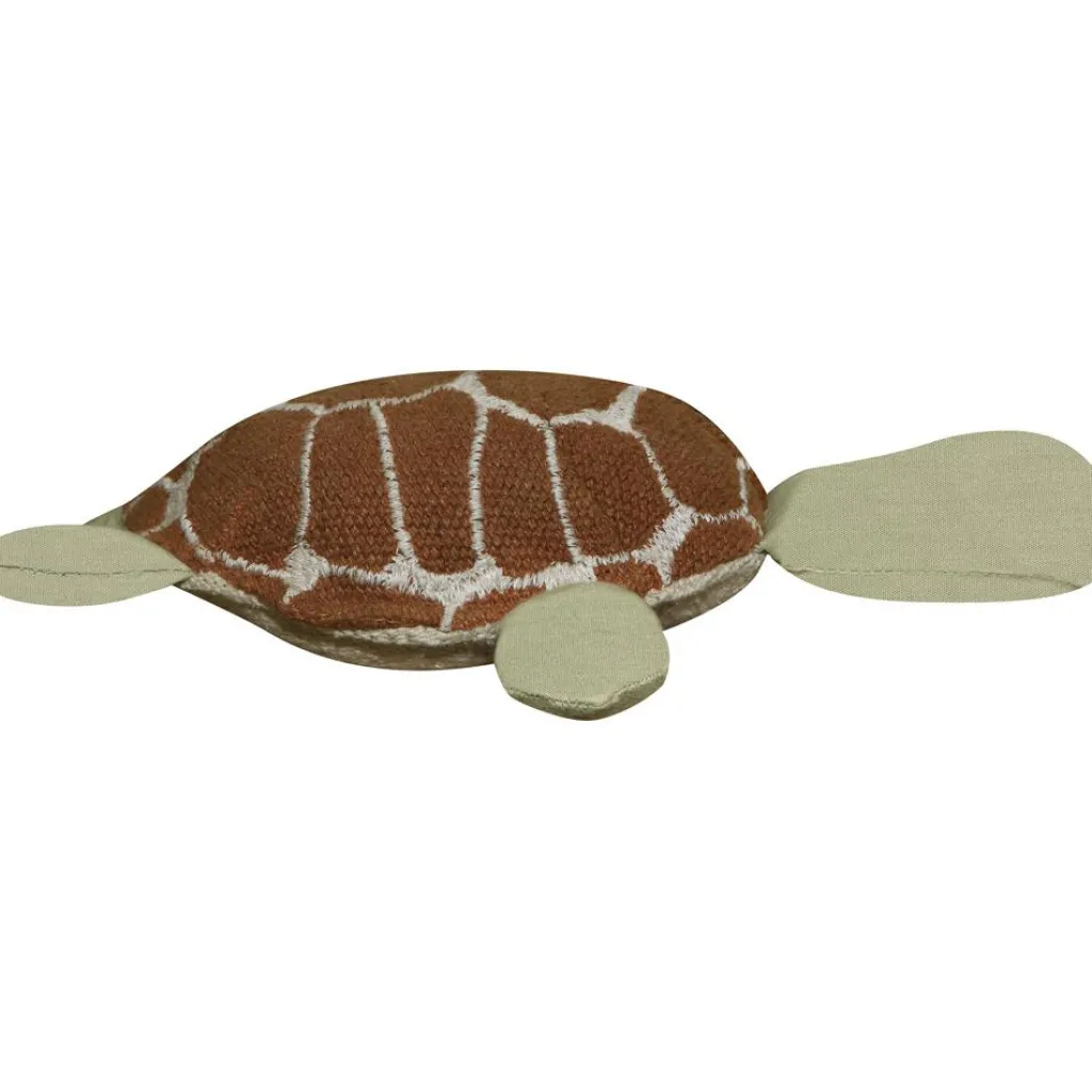 – Le Ride&Roll Turtle se compose d’une tortue en toile de coton caramel, avec des pattes vert olive et une carapace brodée.