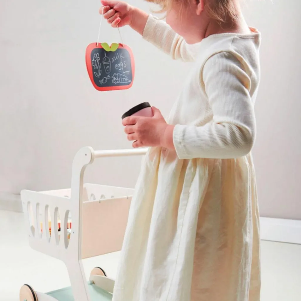 – Une base en tissu ajoute de l’espace pour toutes ces friandises de supermarché et un joli tableau en forme de pomme est parfait pour écrire une liste de courses ou dessiner des images.