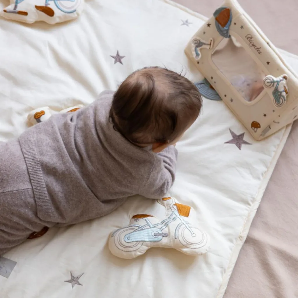 – Le miroir position ventrale est doté d’intéressantes textures plissées ainsi que d’un accessoire couineur qui permettent de stimuler les facultés motrices fines du bébé en âge de se déplacer et de toucher le miroir.