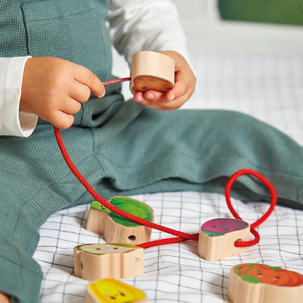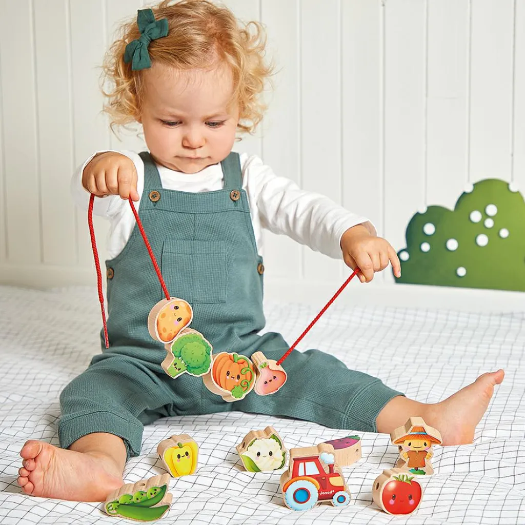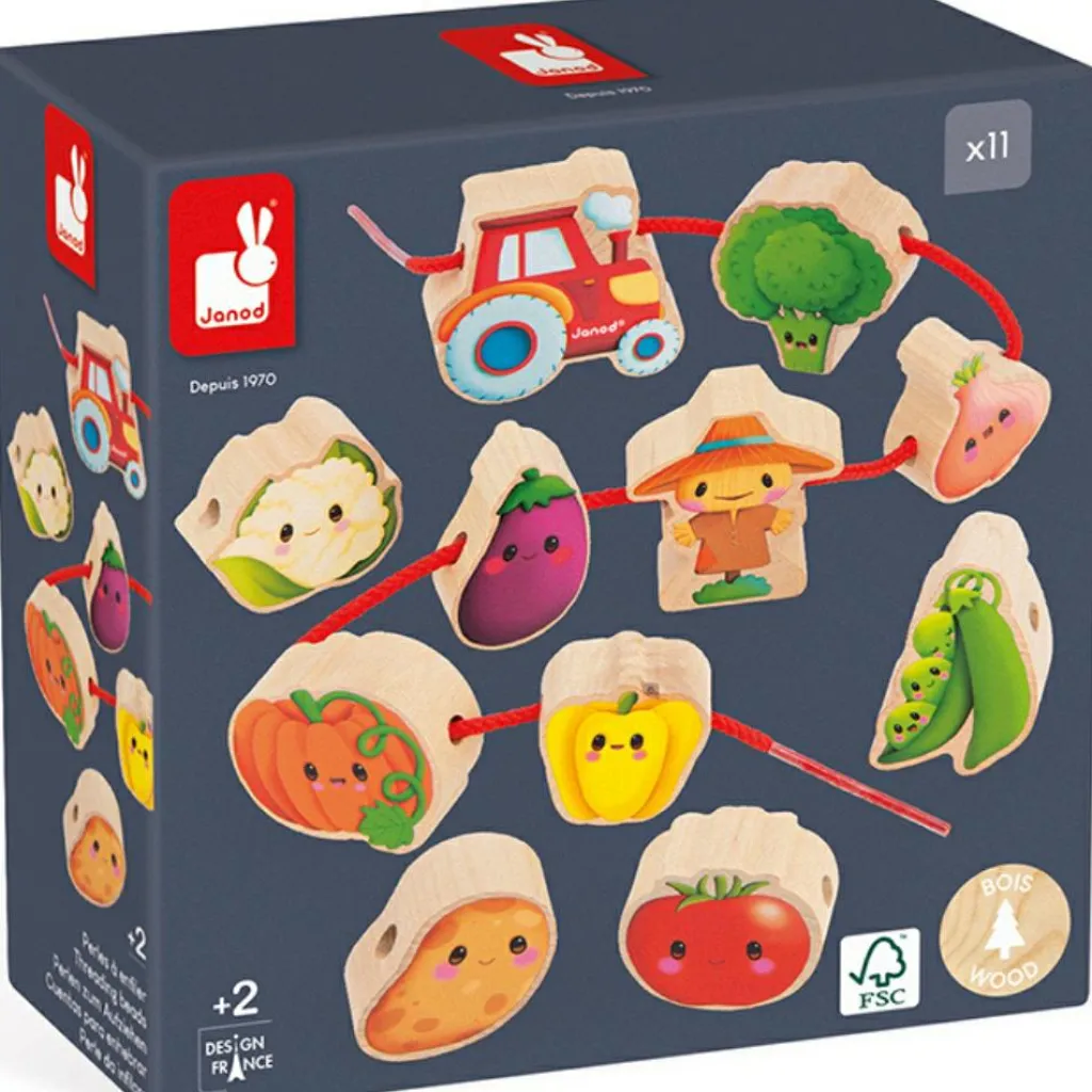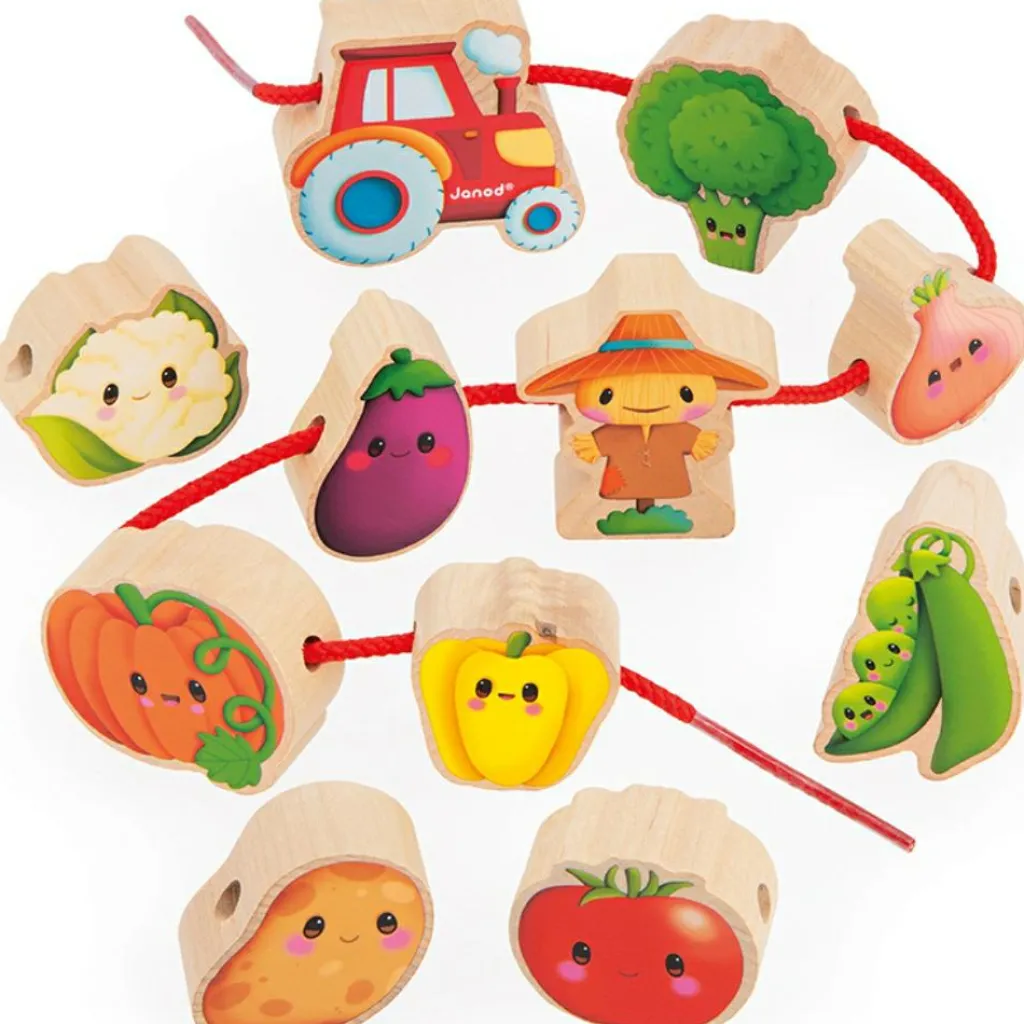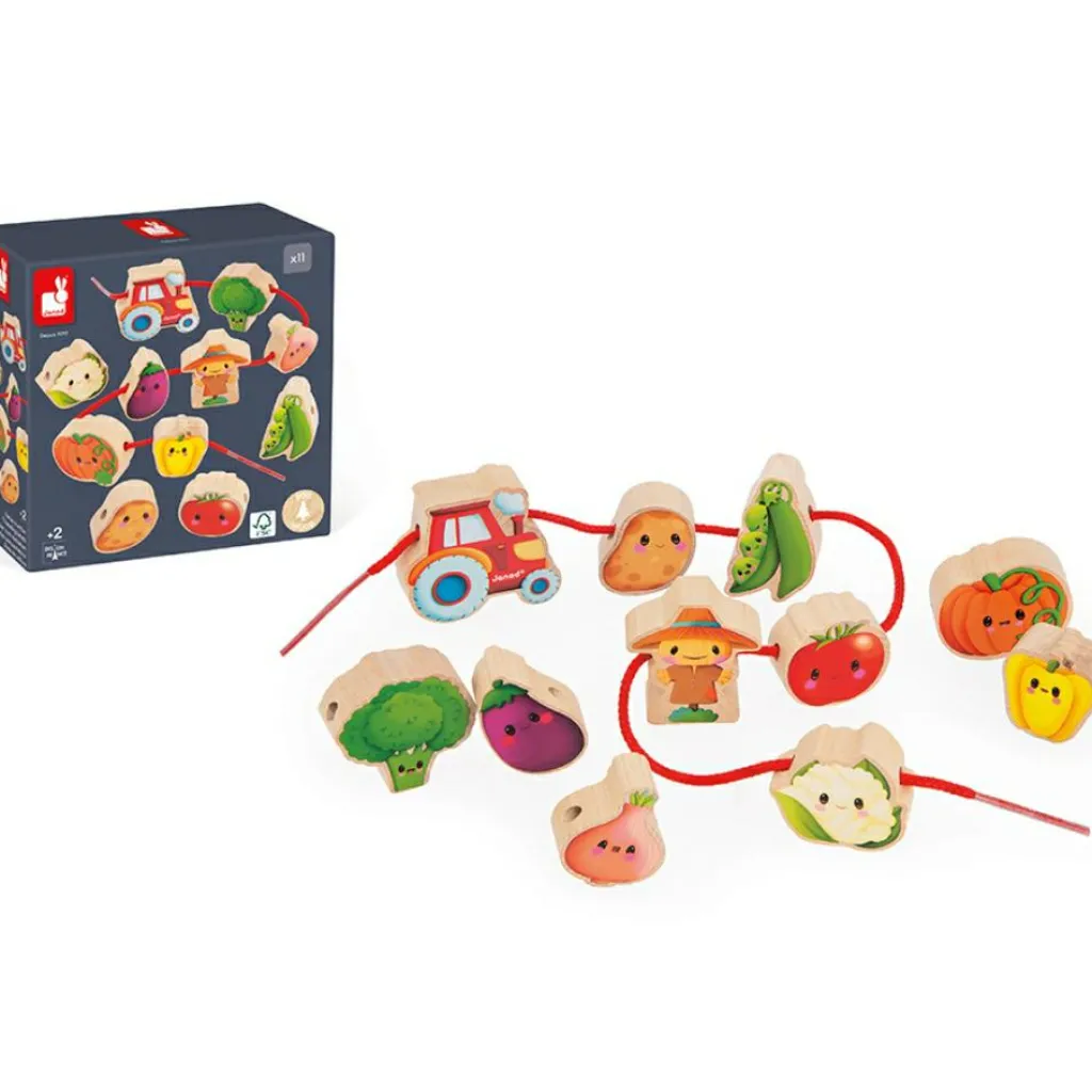 – 9 légumes, 1 tracteur, 1 épouvantail et 2 cordons.