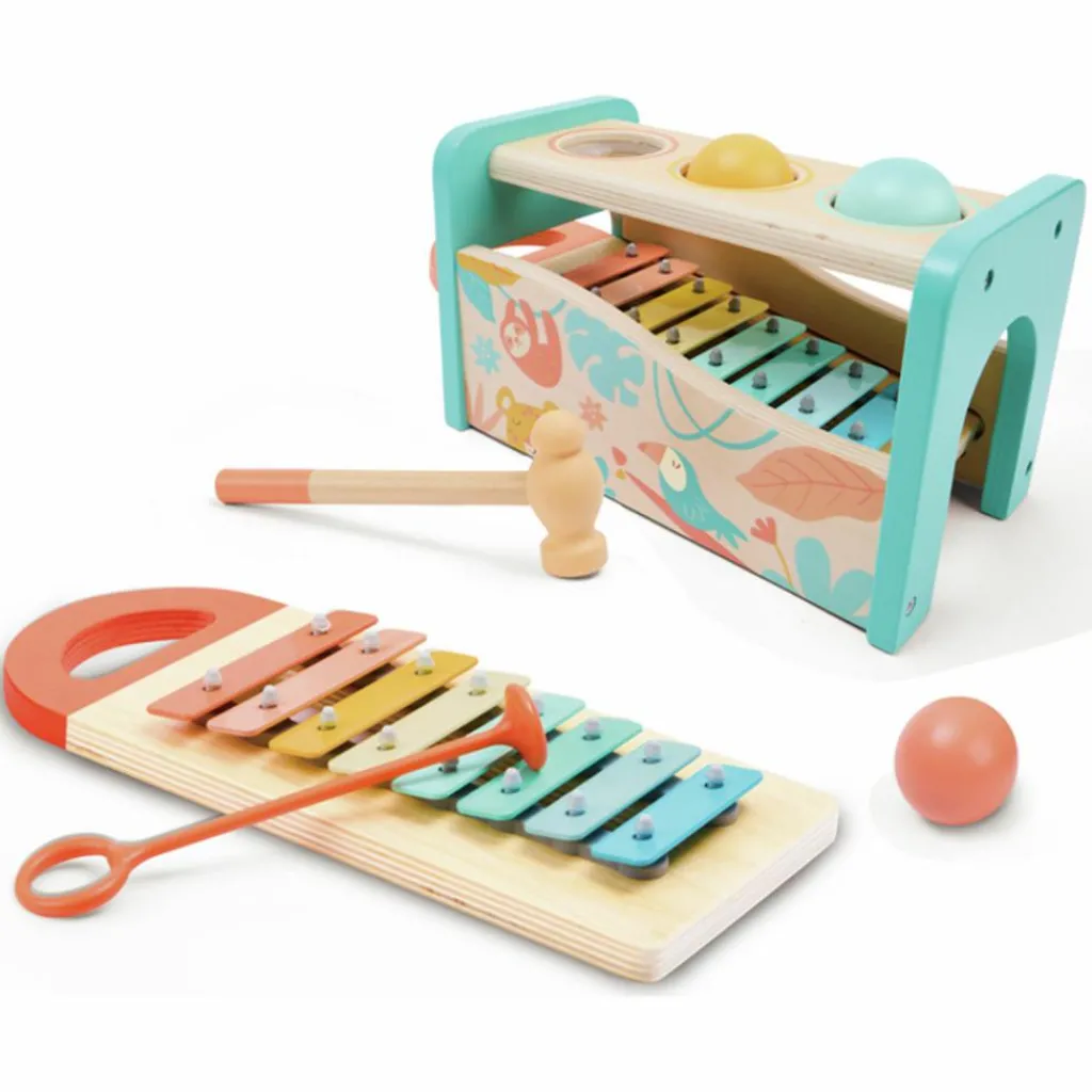 – Inclut : 1 marteau, 3 boules colorées, 1 xylophone amovible.