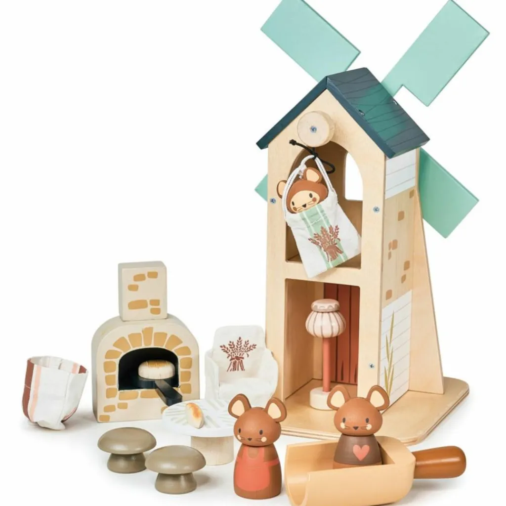 – Les accessoires comprennent : un four à pain, deux pains, une pelle à pain, une table et deux tabourets, un sac à grain, un fauteuil en tissu, une lampe et une pelle à farine qui sert de lit au bébé souris.