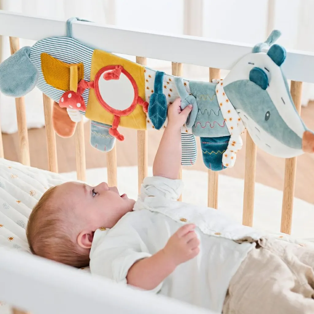 – Avec 2 liens pour attacher au lit de bébé, au berceau, à la poussette ou au siège auto.