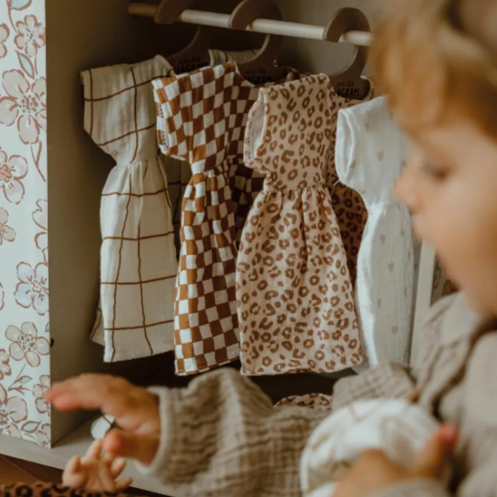 Avec son doux parfum de vanille et son regard attendrissant, Léa deviendra vite la compagne préférée de votre enfant. Mesurant 34 cm, elle est idéale pour les petites mains et accompagne parfaitement les jeux d’imitation et les moments de tendresse. Sa robe en gaze de coton imprimé léopard, fabriquée avec soin au Portugal, apporte une touche moderne et raffinée au vestiaire de sa poupée.