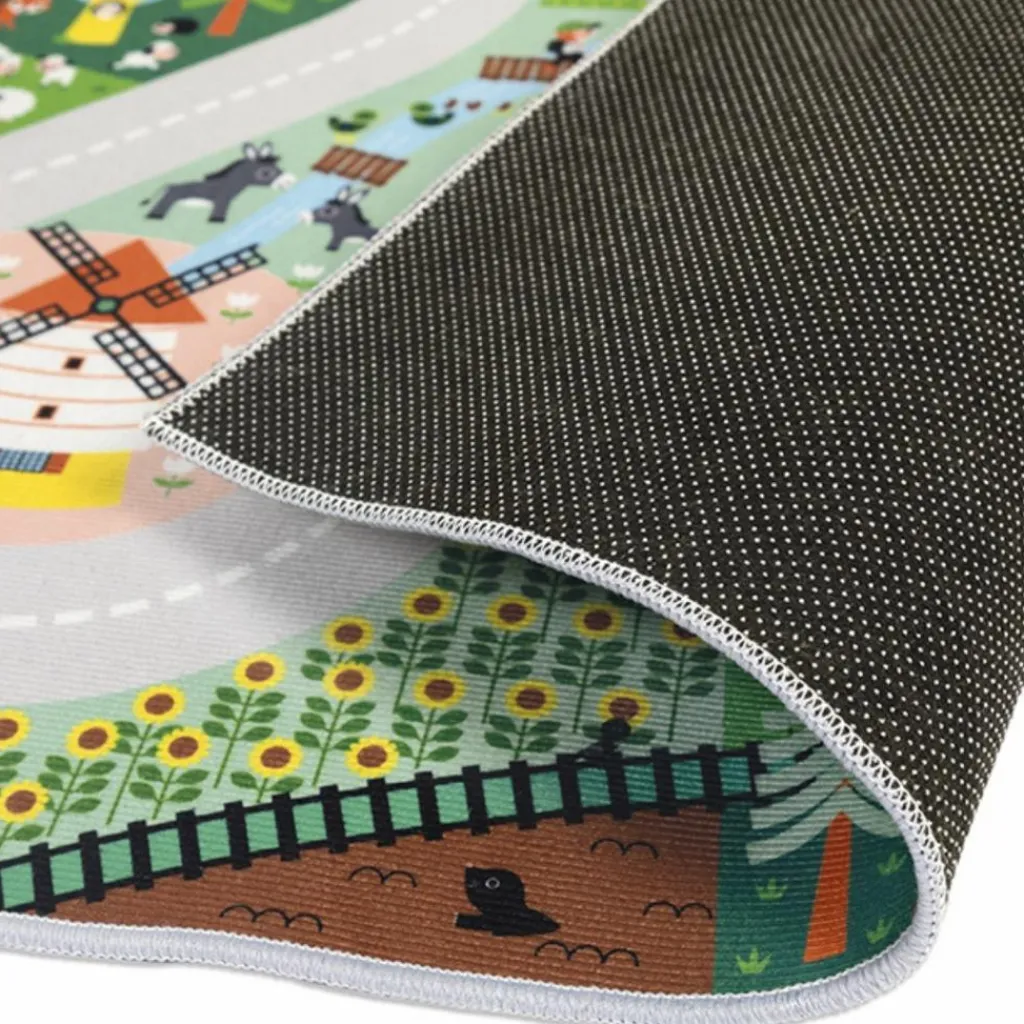 Dès 2 ans, les petits aventuriers peuvent partir à la découverte de la vie à la campagne. Ce tapis de jeu de 120 x 78 cm met en scène un univers rural plein de charme : fermes, prairies, tracteurs, animaux, sentiers et champs se déploient pour créer une ambiance paisible et joyeuse. Les enfants adorent faire rouler leurs petites voitures sur les routes sinueuses, s’arrêter près des cultures ou imaginer des scènes avec les animaux de la ferme. Chaque partie du tapis raconte une histoire… à eux de l’inventer !