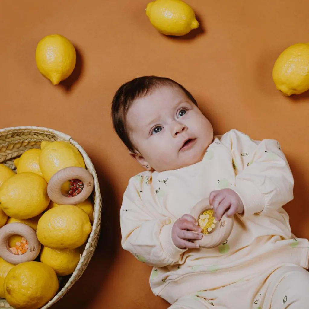 Découvrez le hochet sensoriel Sensory Donut citrons de Petit Boum, un jouet d’éveil ludique pour les tout-petits !