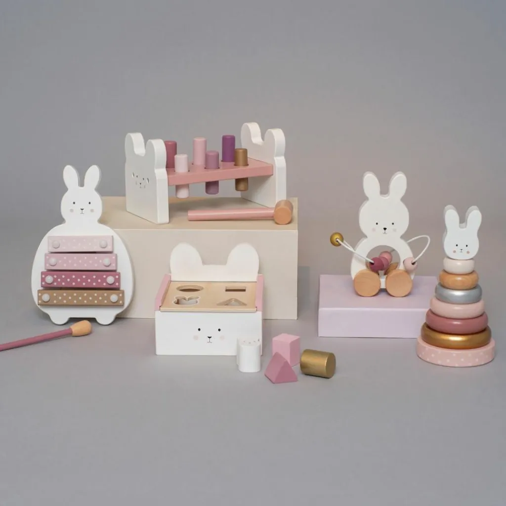 – Jouet à tirer en forme de lapin en bois.