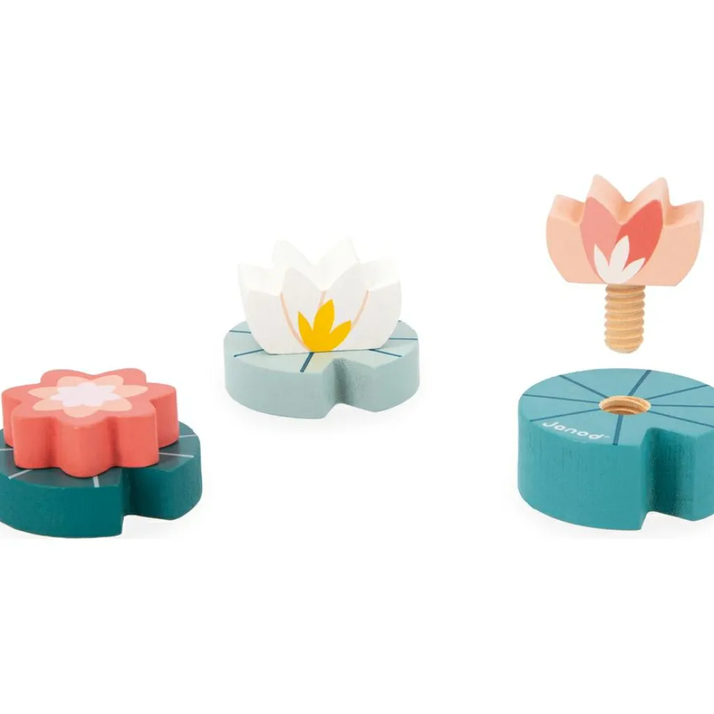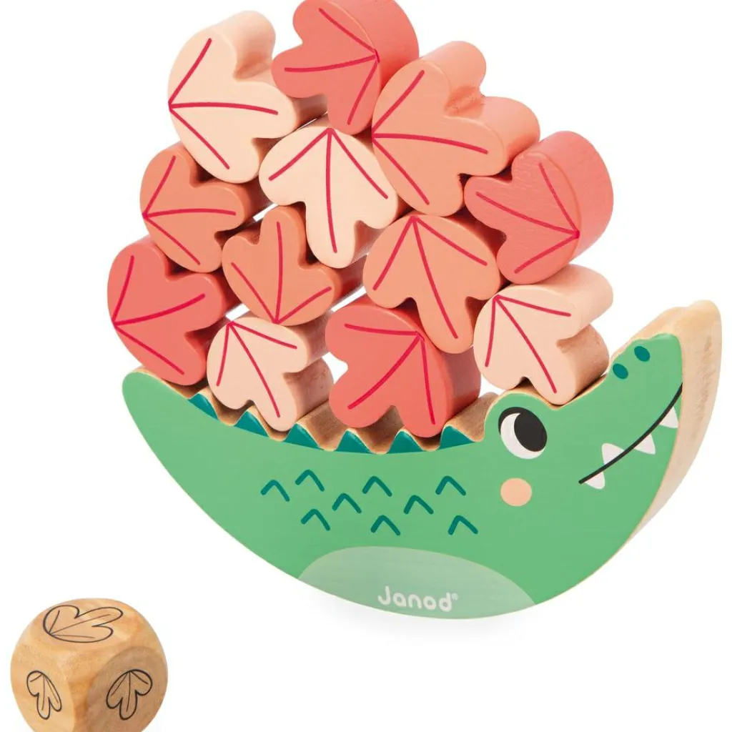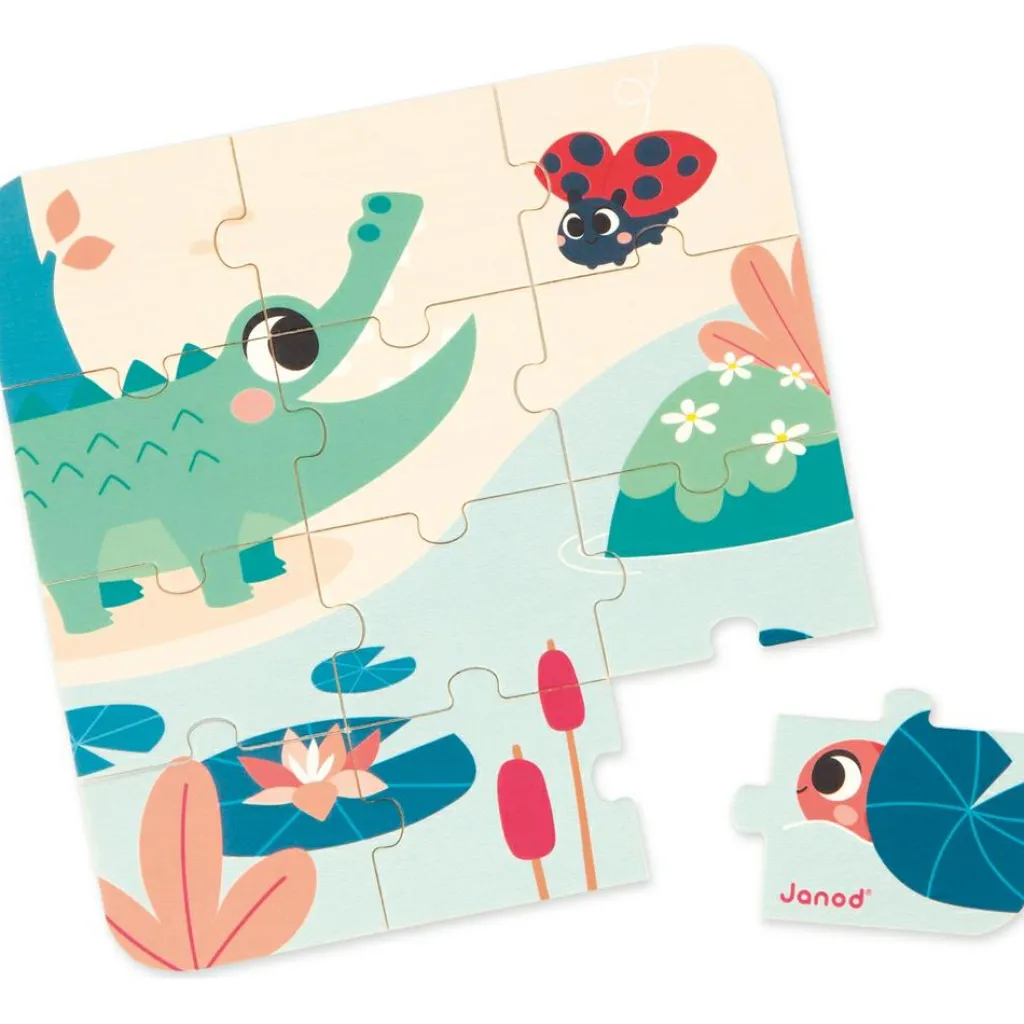 – 1 crocodile d’équilibre, 3 nénuphars à visser, 3 clochettes, 1 puzzle de 12 pièces.