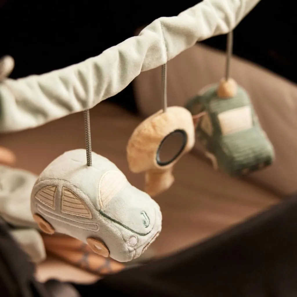 – Peut être fixé sur le cosy, la poussette, le parc, les barreaux du lit, etc.