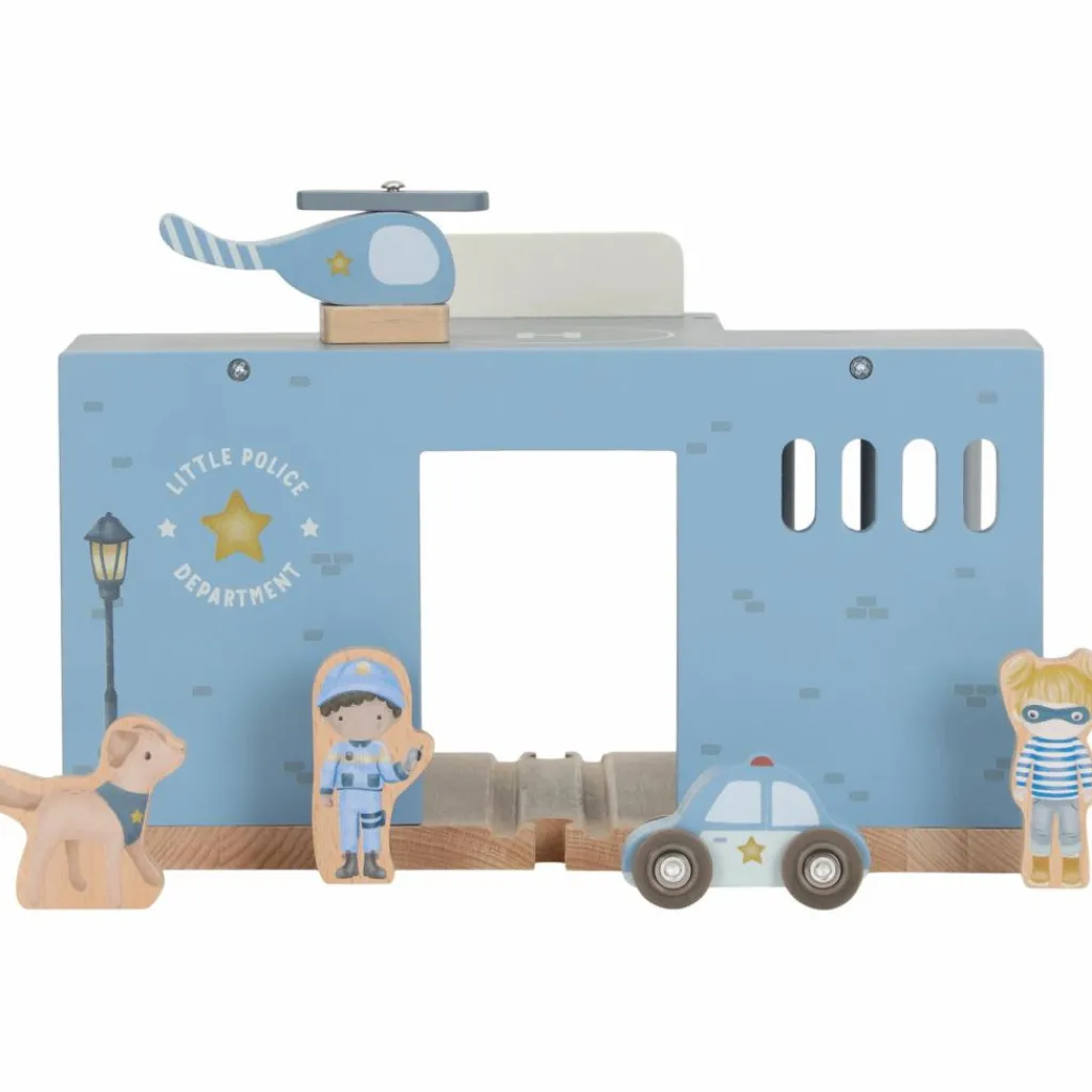 – Poste de police en bois avec cellule à barreaux. – Contient : 1 voiture de police, 1 hélicoptère, 1 officier, 1 voleur et 1 chien policier. – Avec plateforme d’atterrissage. – Matériau : bois solide et écologique. – Compatible avec d’autres jouets en bois.