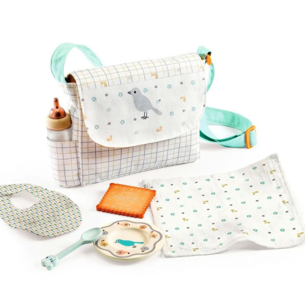 – Sac en tissu avec bandoulière réglable et poche biberon latérale.