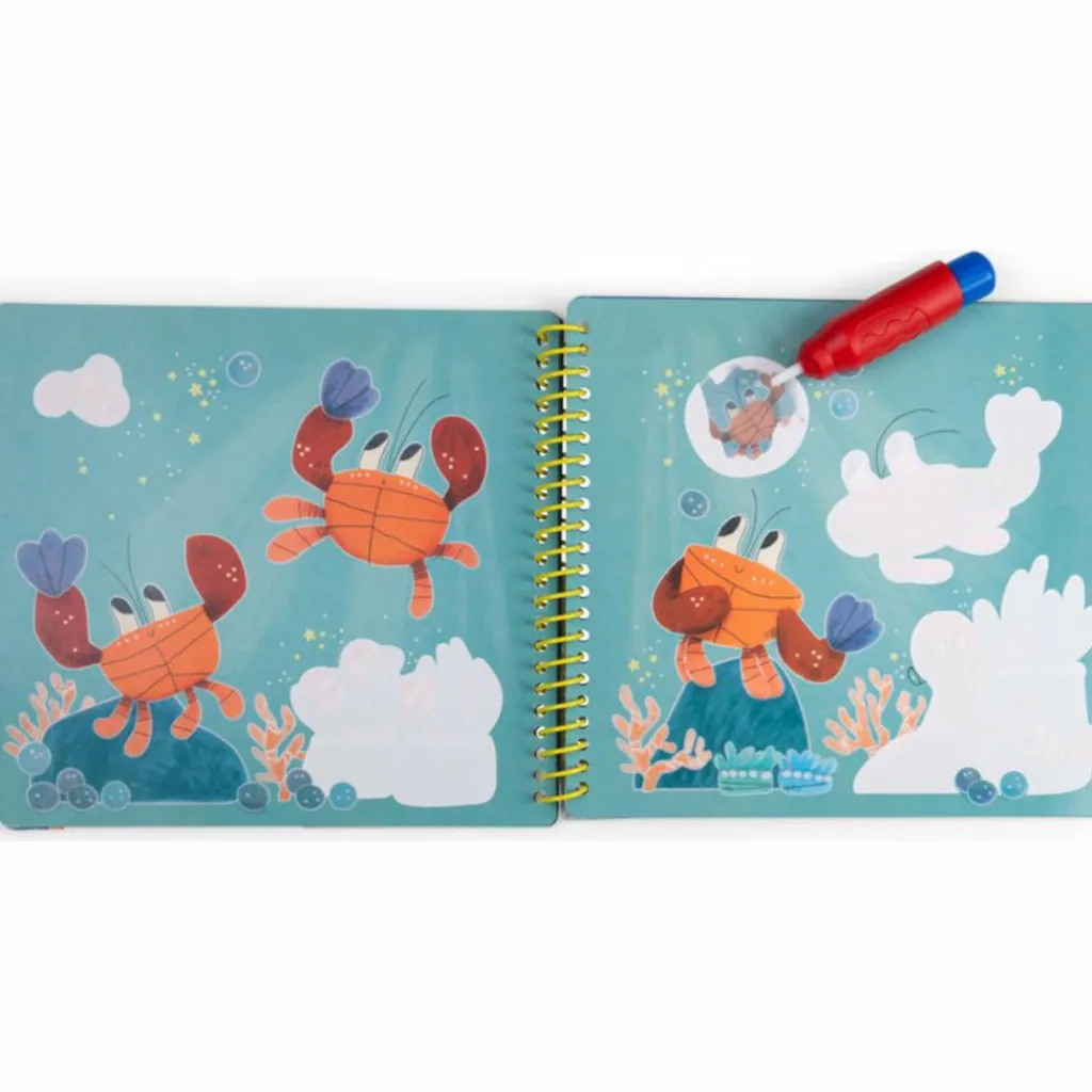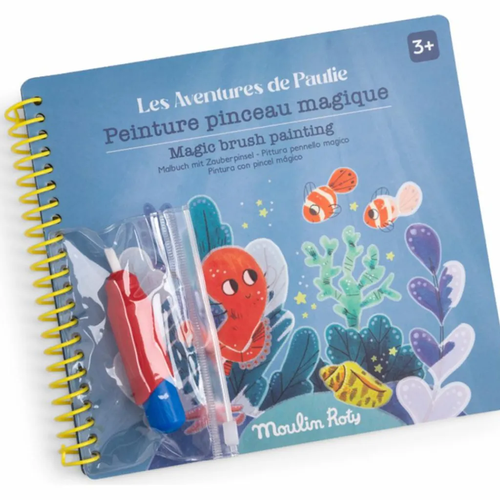 – Grâce à un pinceau magique avec réservoir d’eau, peins les zones blanches sur chaque page pour faire apparaître comme par magie les illustrations de Paulie le poulpe et ses amis.