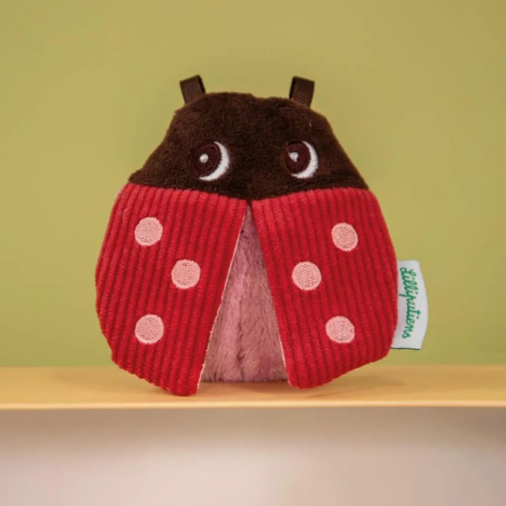 – La coccinelle : ses matières variées et motifs brodés stimulent le toucher et l’exploration tactile.